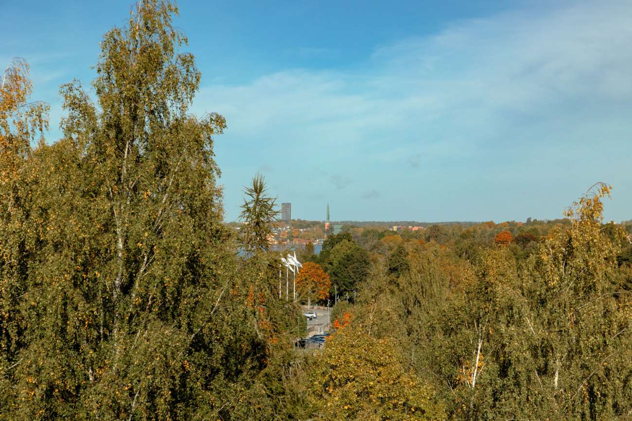 Sovrummet är rofyllt, med grönskande vyer från sjätte våningen. Längs en vägg löper smart förvaring med integrerad belysning, Som kronan på verket hittar du ytterligare ett rum en trappa upp – bostadens verkliga guldkorn. Här bjuder generös takhöjd, en fantastisk fönsterlösning och obruten utsikt på ett rum som passar lika bra som arbetsplats som för återhämtning. Det triangelformade fönstret ramar in den lummiga omgivningen och ger en känsla av att befinna sig ovanför stadens brus – med naturen som närmaste granne. Ljuset, volymen och utsikten skapar tillsammans en atmosfär som sällan upplevs i lägenheter.