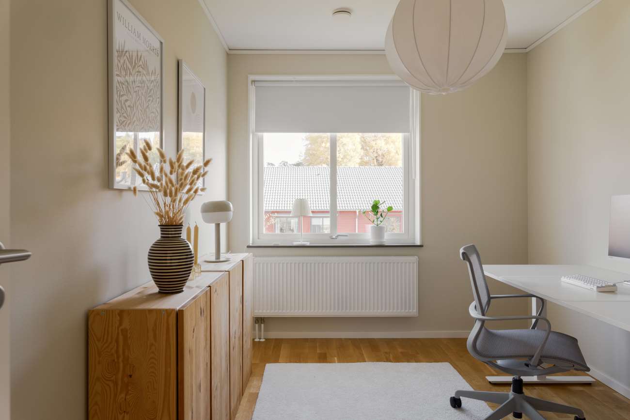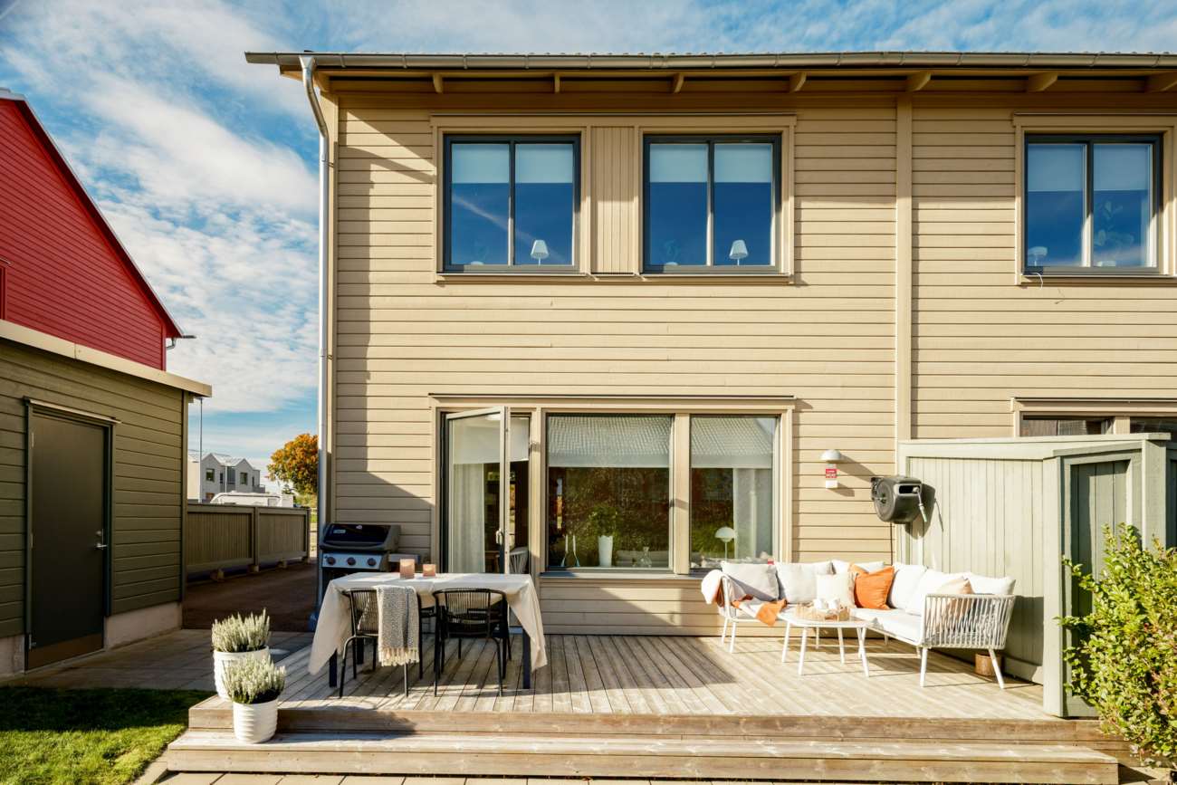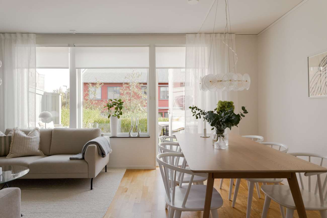 Vardagsrummet, på cirka 20 kvm, har utgång till den trivsamma uteplatsen med trädäck. Hela bottenvåningen har behaglig golvvärme, och den generösa takhöjden på 2,50 meter bidrar till en luftig och rymlig känsla. De välplacerade fönstren gör att dagsljuset flödar genom hela bostaden och förstärker känslan av ljus och rymd.