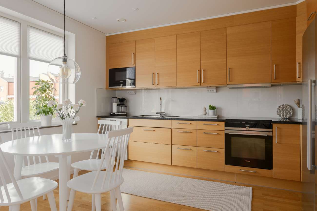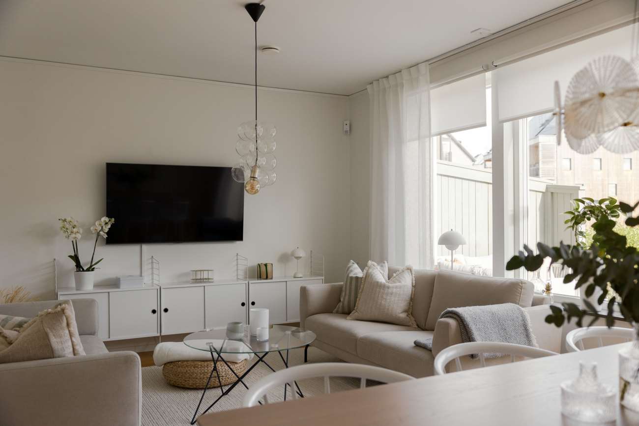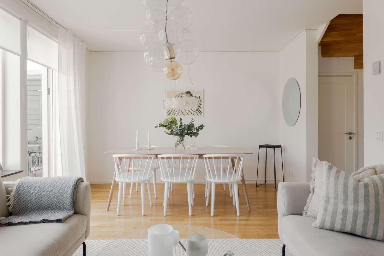 Vardagsrummet, på cirka 20 kvm, har utgång till den trivsamma uteplatsen med trädäck. Hela bottenvåningen har behaglig golvvärme, och den generösa takhöjden på 2,50 meter bidrar till en luftig och rymlig känsla. De välplacerade fönstren gör att dagsljuset flödar genom hela bostaden och förstärker känslan av ljus och rymd.