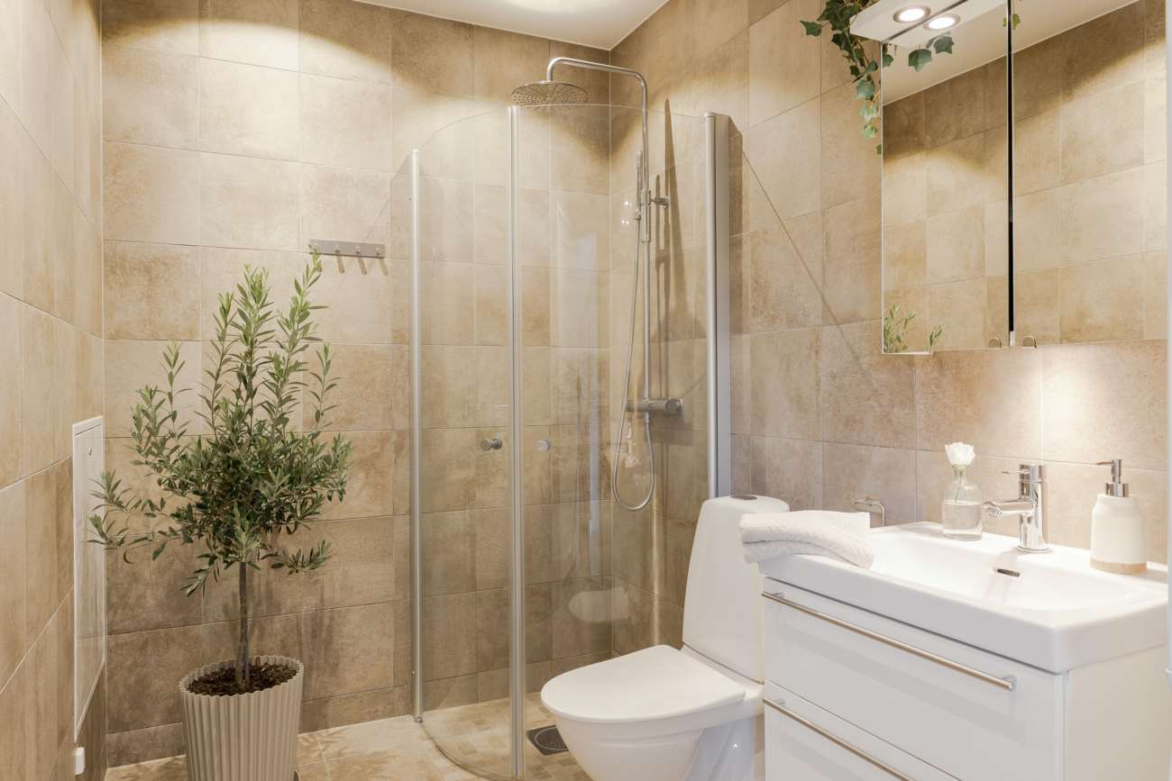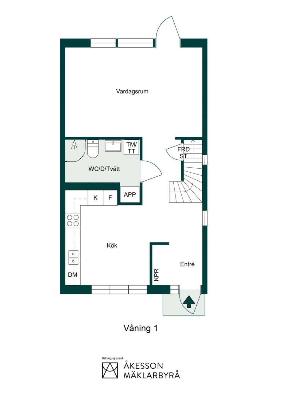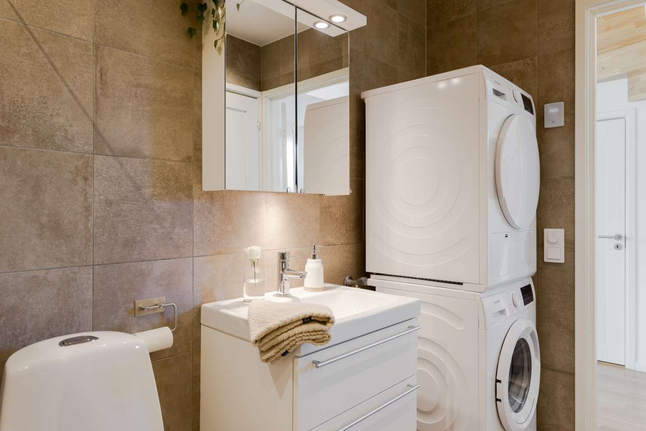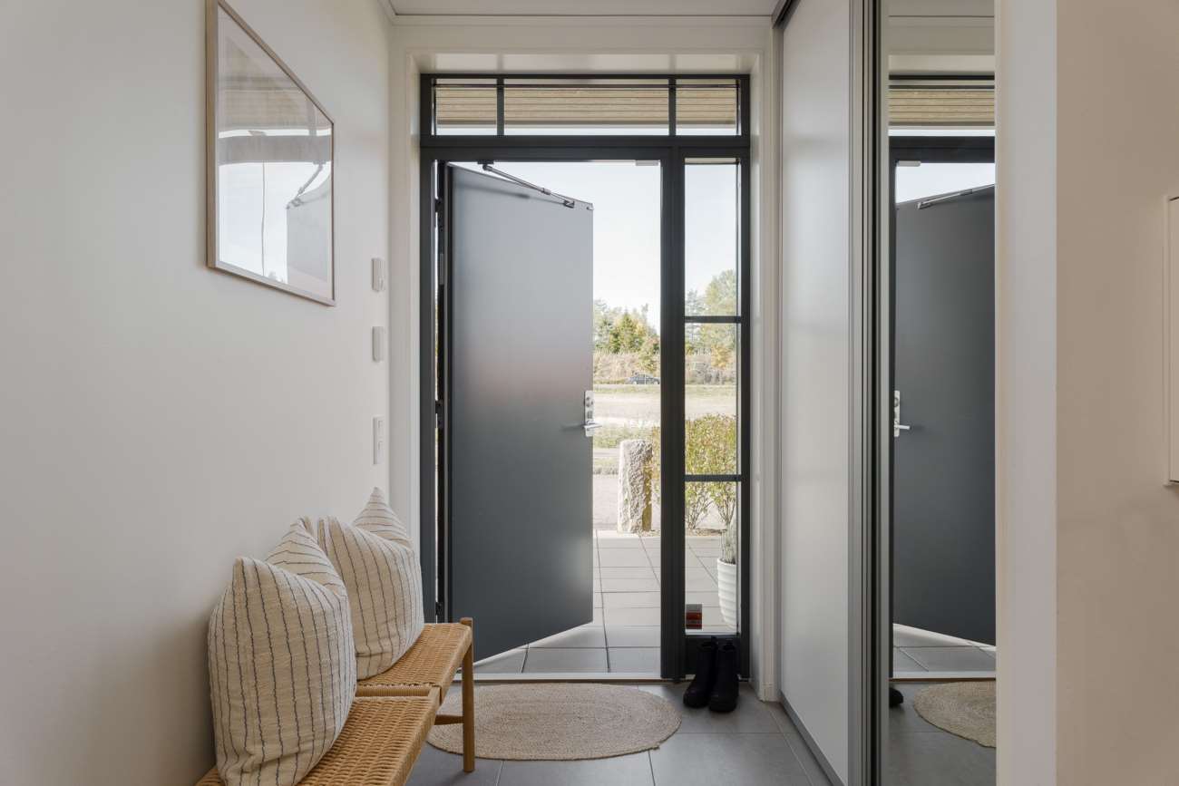Innanför dörren öppnar sig en ljus och inbjudande hall med gott om plats för avhängning. Golvet är belagt med stilren grå klinker. Från hallen leder trappan upp till övre plan, och under trappan finns ett praktiskt förråd. På entréplanet finns även ett välplanerat HTH-kök samt ett badrum med wc, dusch med välvda glasdörrar, kommod, tvättmaskin och torktumlare.
