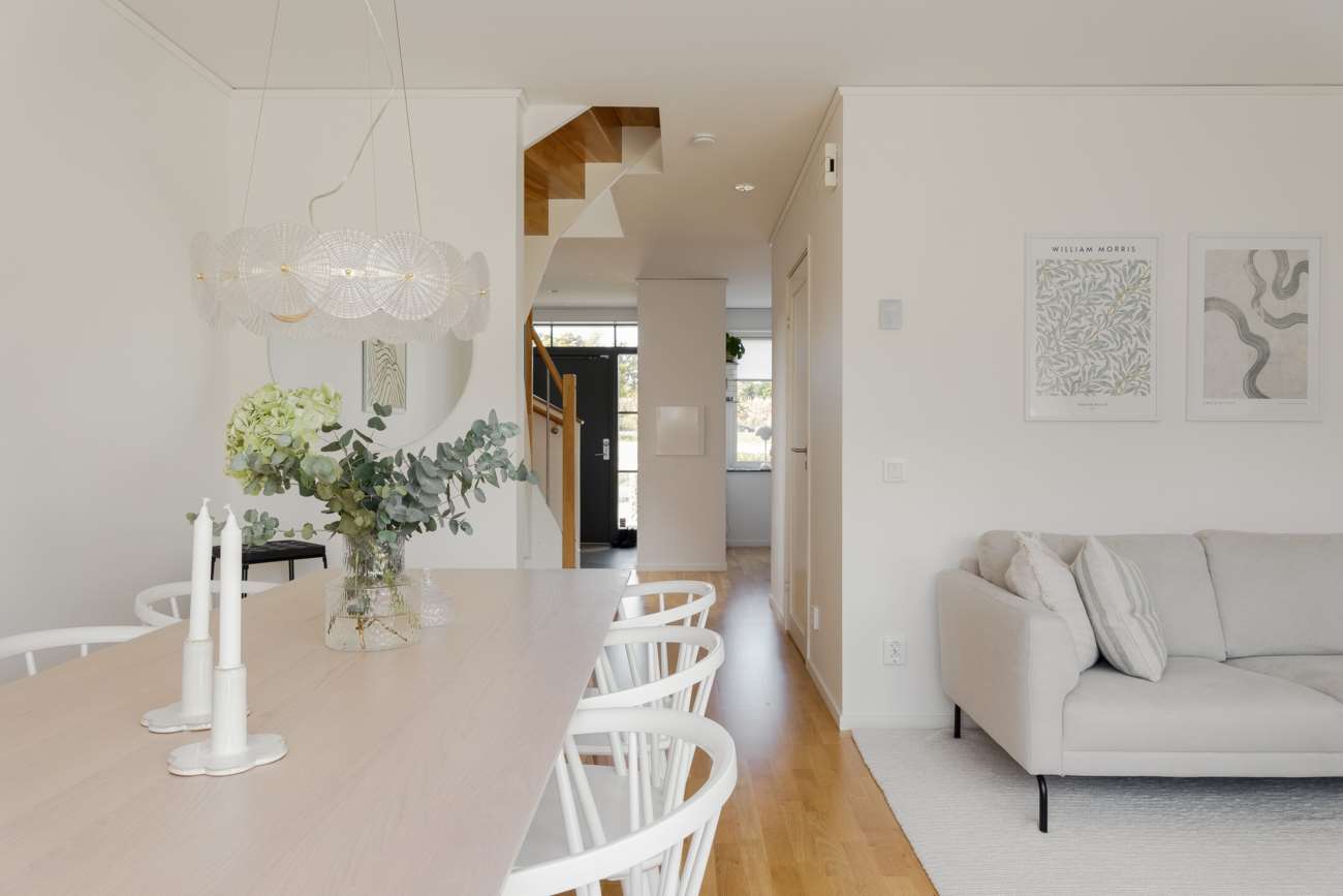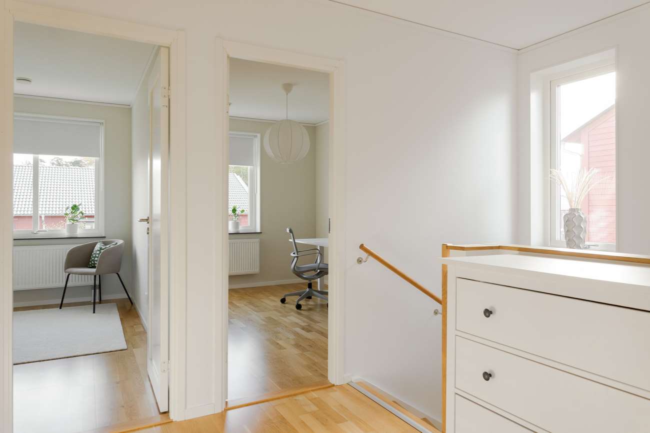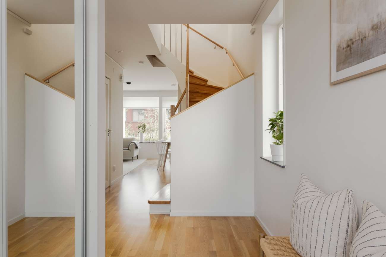 Genomgående ekparkett löper genom bostaden, och även trappans räcke är vackert utfört i samma material – en enhetlig och elegant detalj.