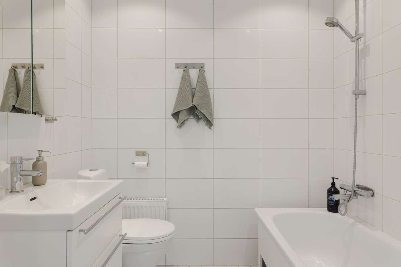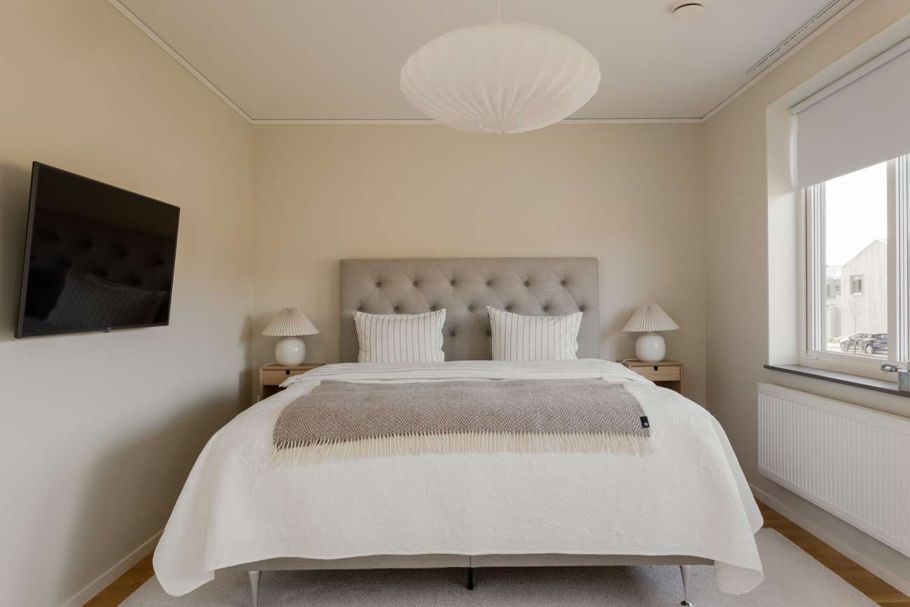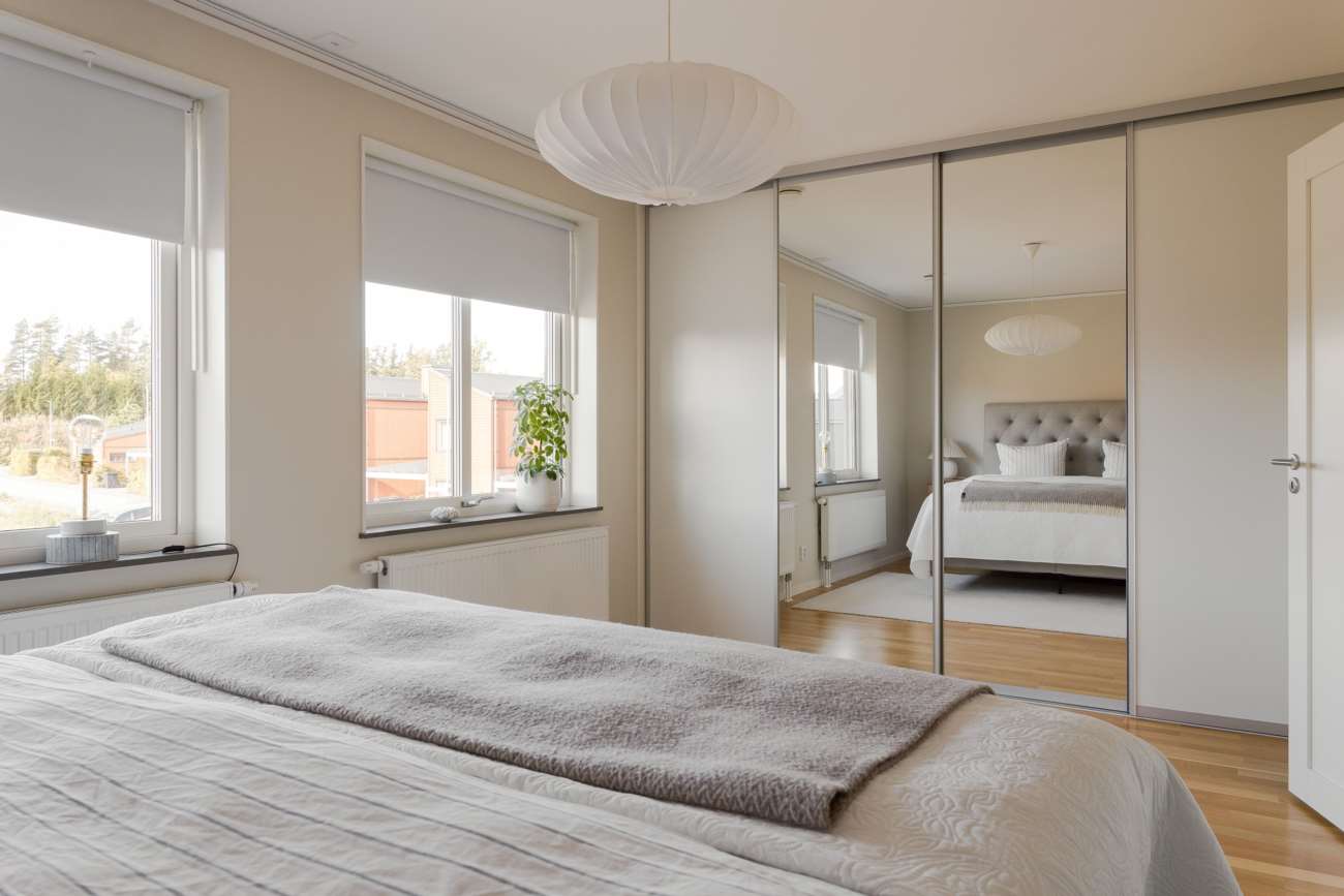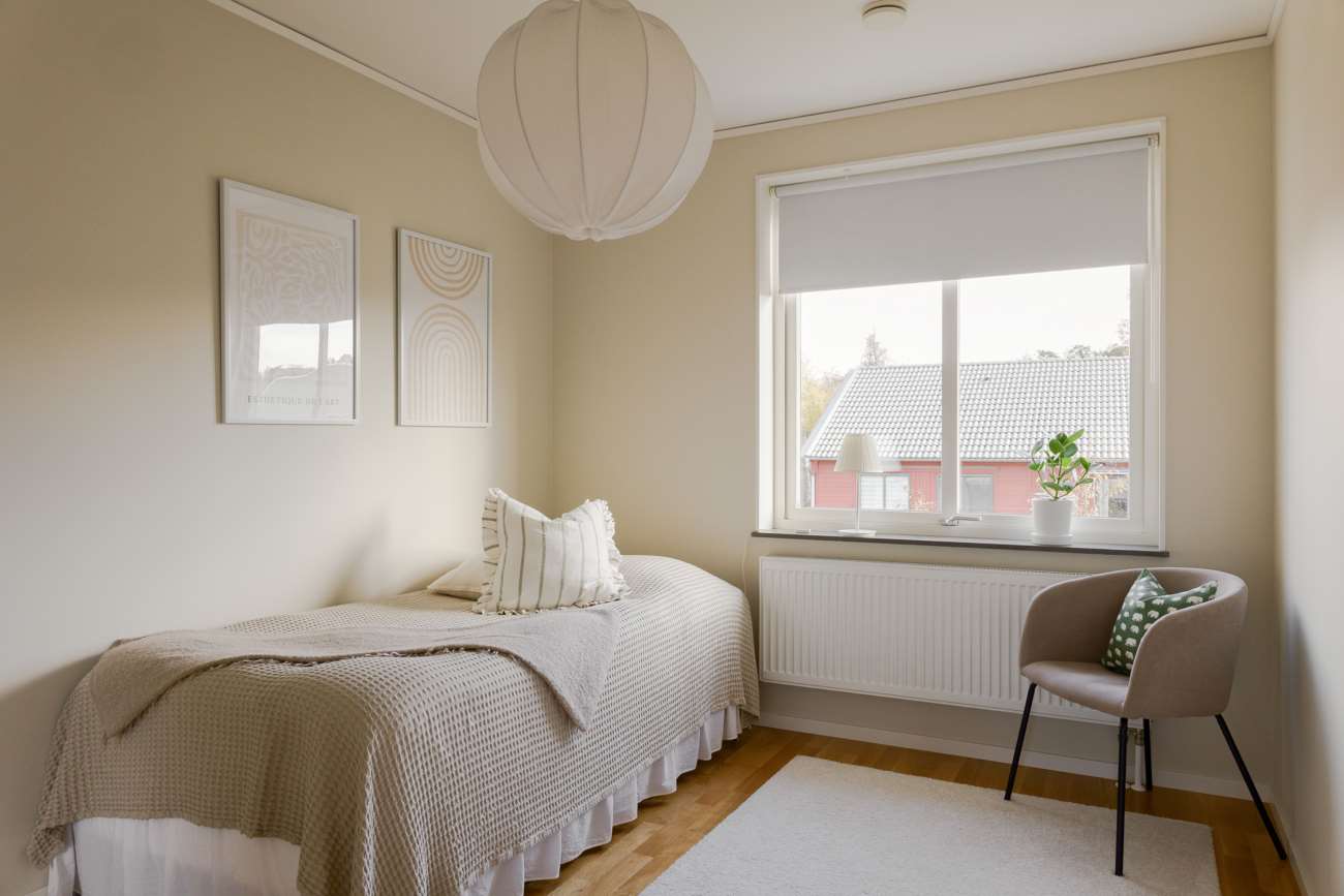 På övre våningen finns tre sovrum samt ett smakfullt inrett badrum. Master bedroom erbjuder en härlig rymd med sina cirka 18 kvm och har en lång skjutgarderob längs hela kortsidan.