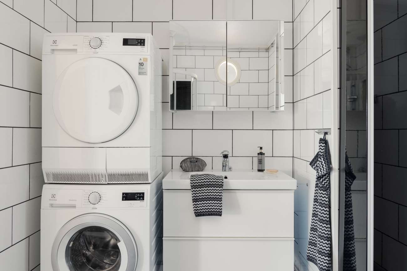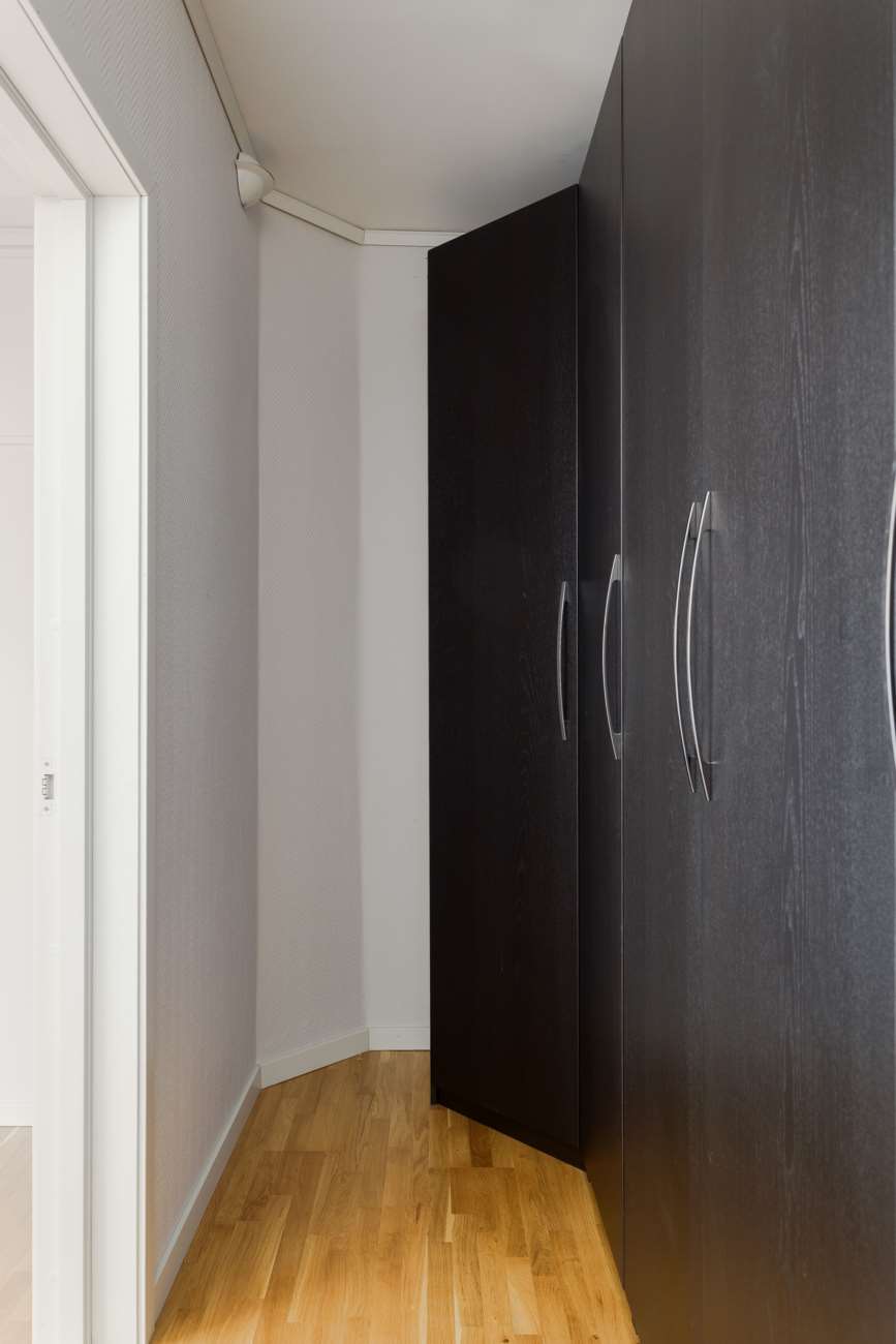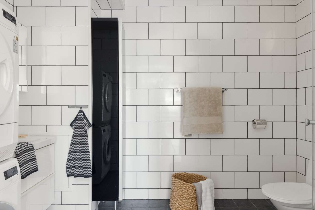 Badrummet är smart planerat med både dusch och tvättdel, och utrustad med tvättmaskin och torktumlare. Utöver detta finns två klädkammare samt flera garderober som ger utmärkta förvaringsmöjligheter.