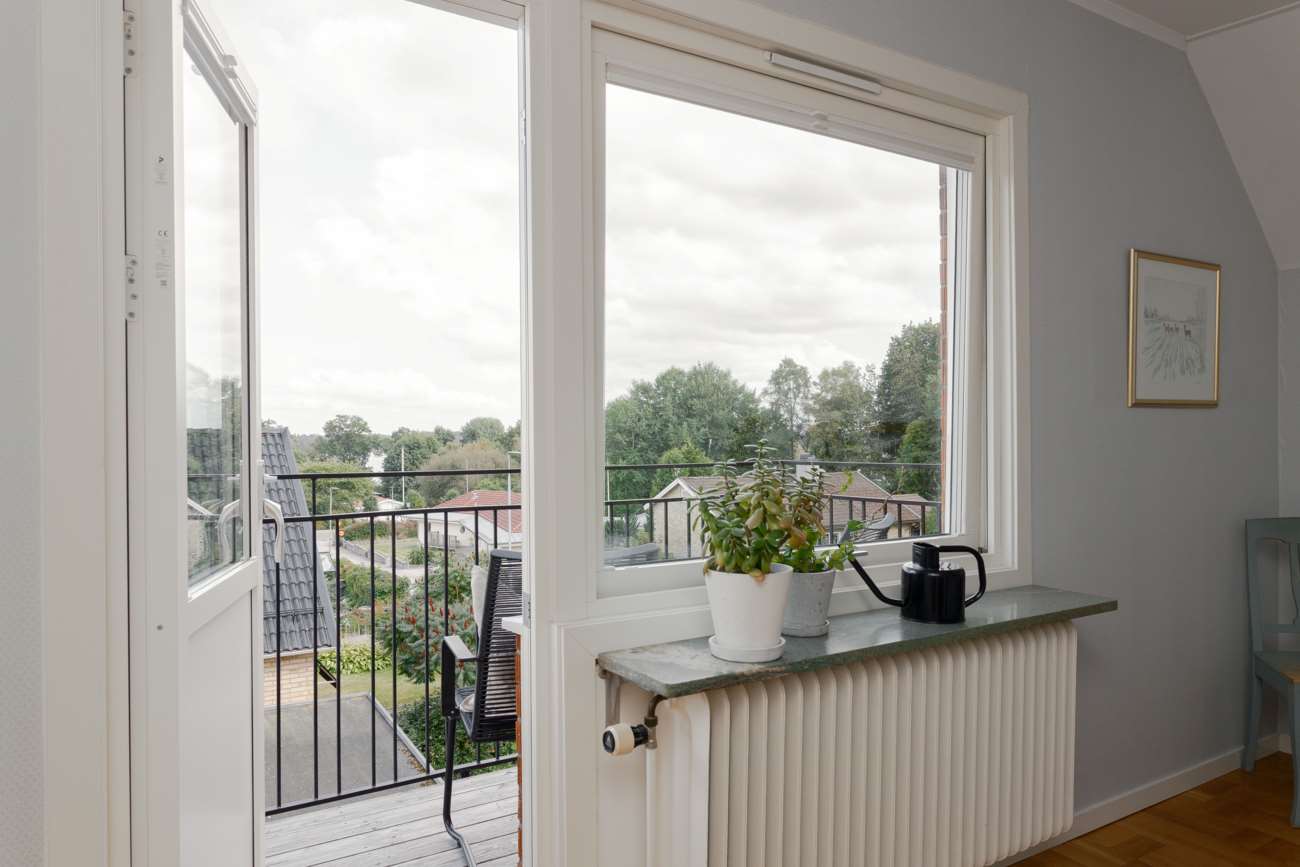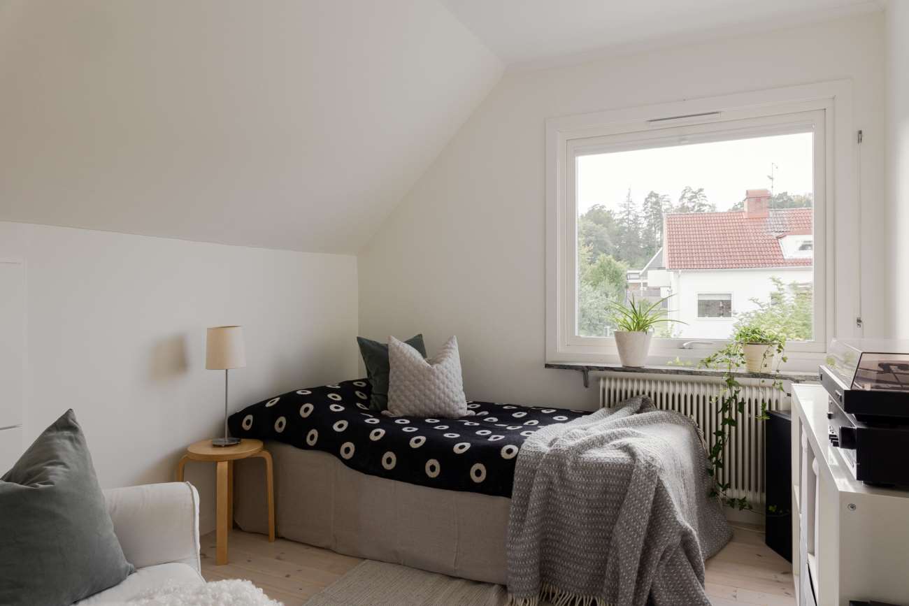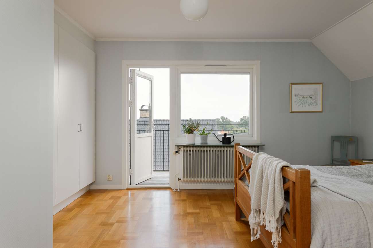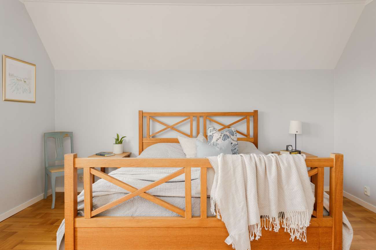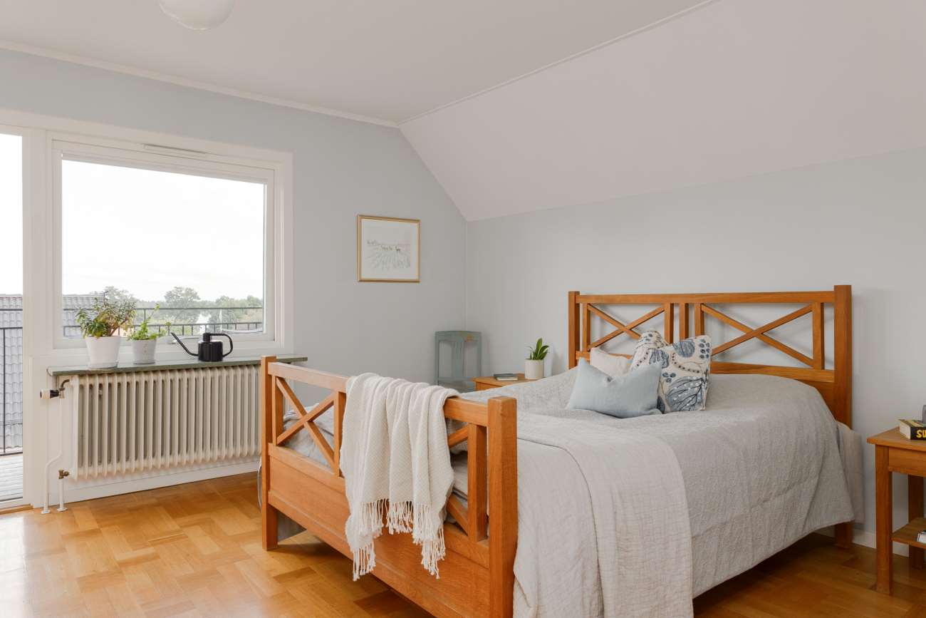 Övervåningen går i samma ljusa och lugna färgskala. Här finns tre sovrum, varav ett större med garderober längs ena väggen och utgång till balkong. De två övriga sovrummen är välproportionerade och fungerar fint som barnrum eller hemmakontor. Det helkaklade badrummet är generöst tilltaget med badkar, dusch, WC och träkommod. Två stora takfönster ger ett fint dagsljus över rummet.