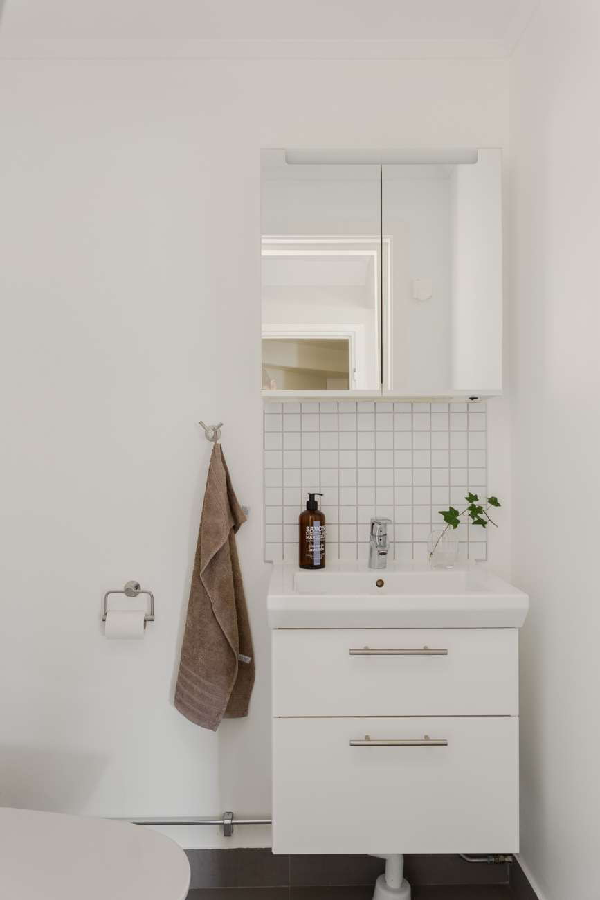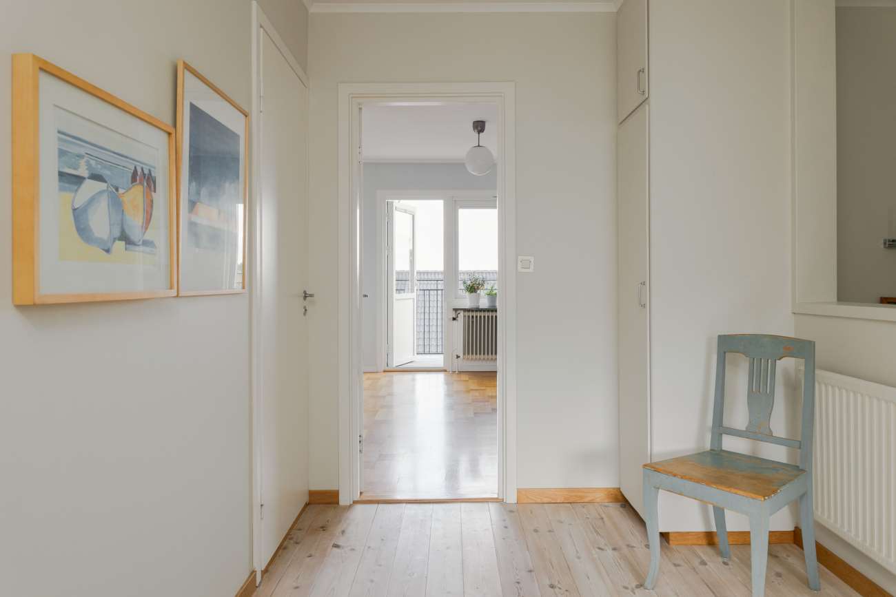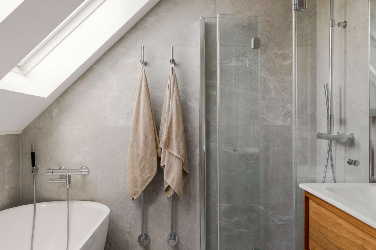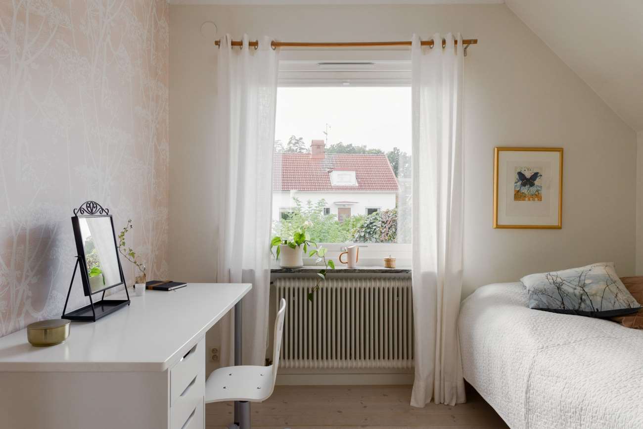 Övervåningen går i samma ljusa och lugna färgskala. Här finns tre sovrum, varav ett större med garderober längs ena väggen och utgång till balkong. De två övriga sovrummen är välproportionerade och fungerar fint som barnrum eller hemmakontor. Det helkaklade badrummet är generöst tilltaget med badkar, dusch, WC och träkommod. Två stora takfönster ger ett fint dagsljus över rummet.