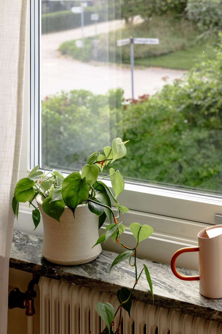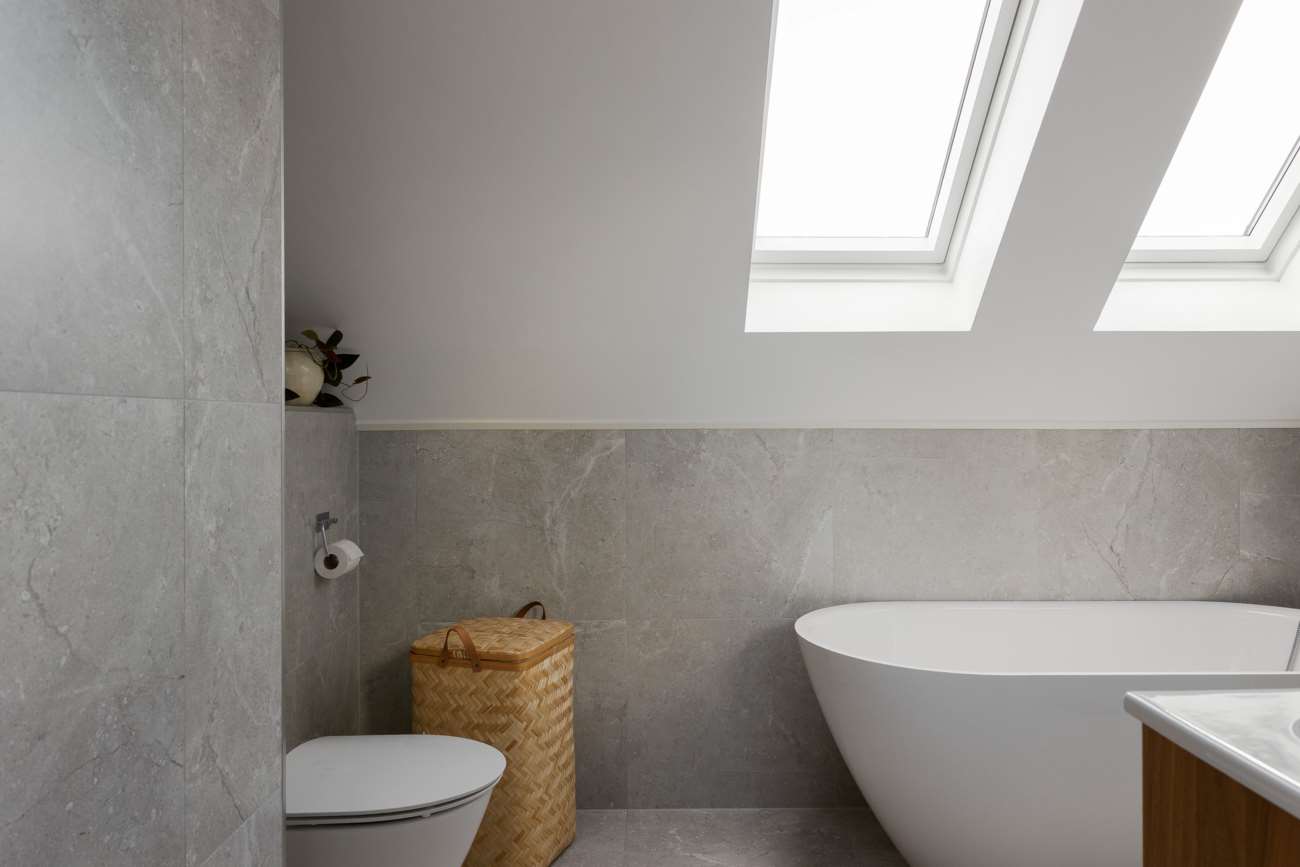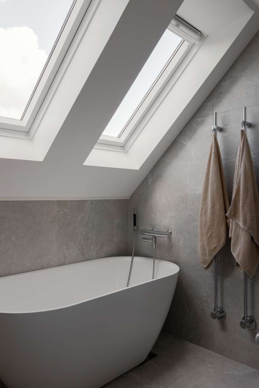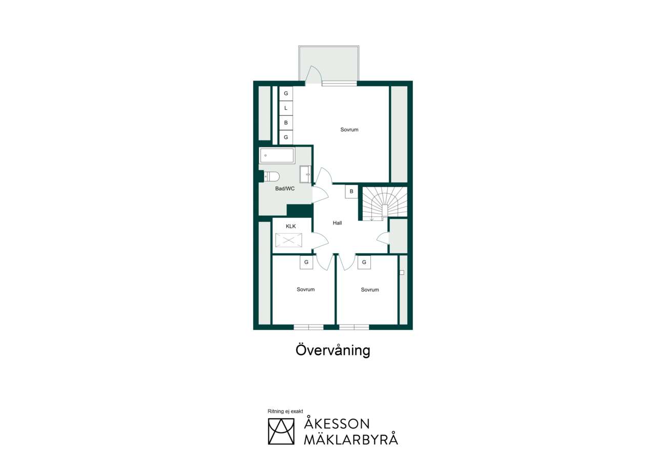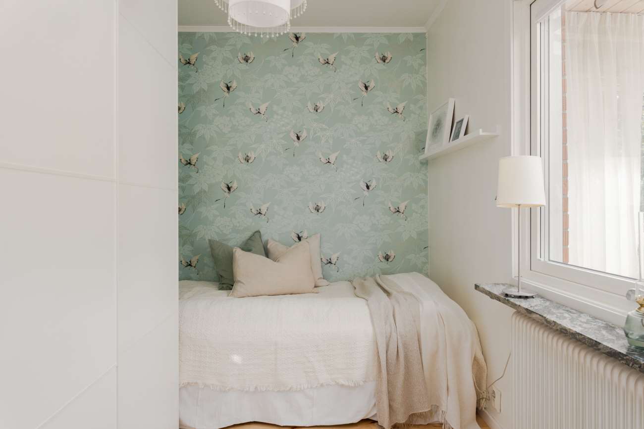 Övervåningen går i samma ljusa och lugna färgskala. Här finns tre sovrum, varav ett större med garderober längs ena väggen och utgång till balkong. De två övriga sovrummen är välproportionerade och fungerar fint som barnrum eller hemmakontor. Det helkaklade badrummet är generöst tilltaget med badkar, dusch, WC och träkommod. Två stora takfönster ger ett fint dagsljus över rummet.