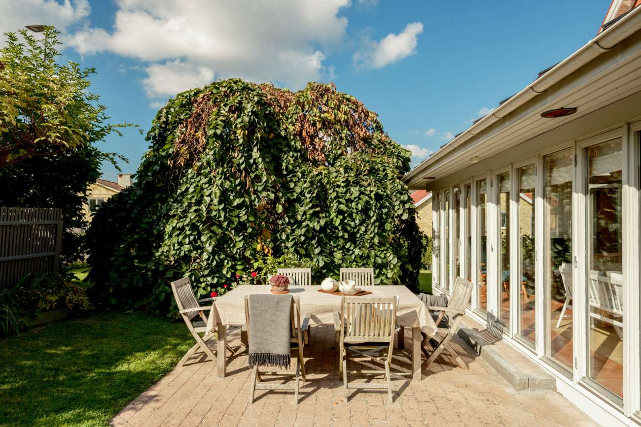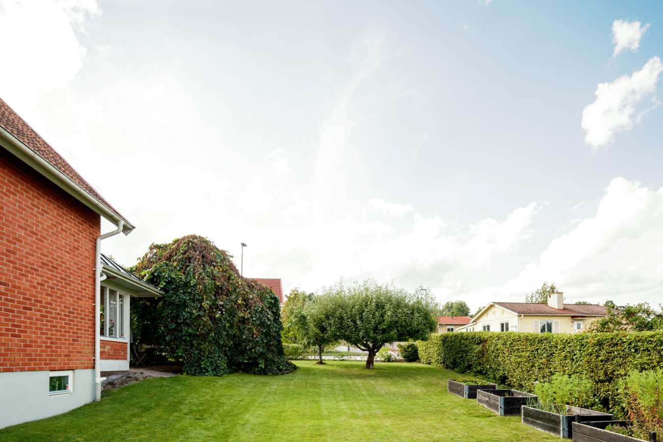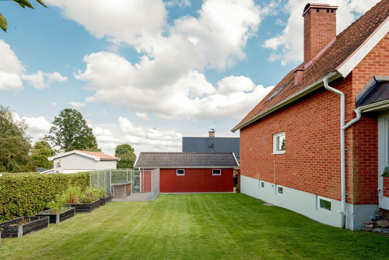 Till huset hör garage med garageport samt en mysig och insynsskyddad trädgård. Den stenlagda uteplatsen skapar en lättskött utemiljö med plats för både vardag och sommarens middagar. Till bostaden hör en båtplats i Helgasjön i Fridhemsvägens bryggförening (ligger en kort promenad från huset)..