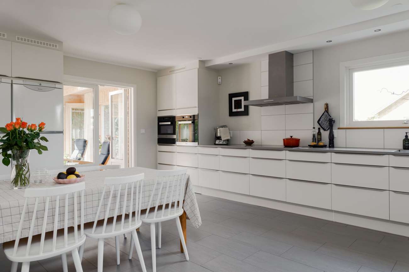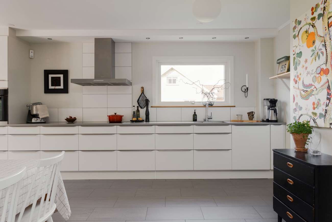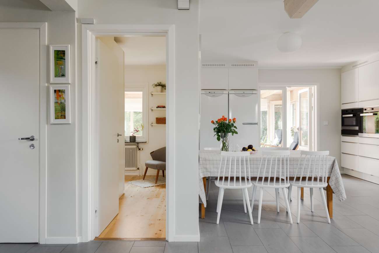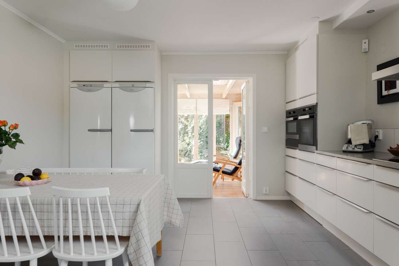 Entréplanet präglas av generösa sällskapsytor och ett naturligt flöde mellan kök och vardagsrum. Köket är rymligt och funktionellt, med släta vita luckor, grå bänkskivor och vitt kakel. Utrustningen är väl tilltagen med spishäll, takhängd fläktkåpa, dubbla ugnar, diskmaskin samt kyl och frys. Grått klinkergolv och infällda spotlights över arbetsytorna ger en praktisk vardag, medan matplatsen rymmer större sällskap. Härifrån nås det inglasade uterummet i västerläge, en förlängning av köket med kvällssol.