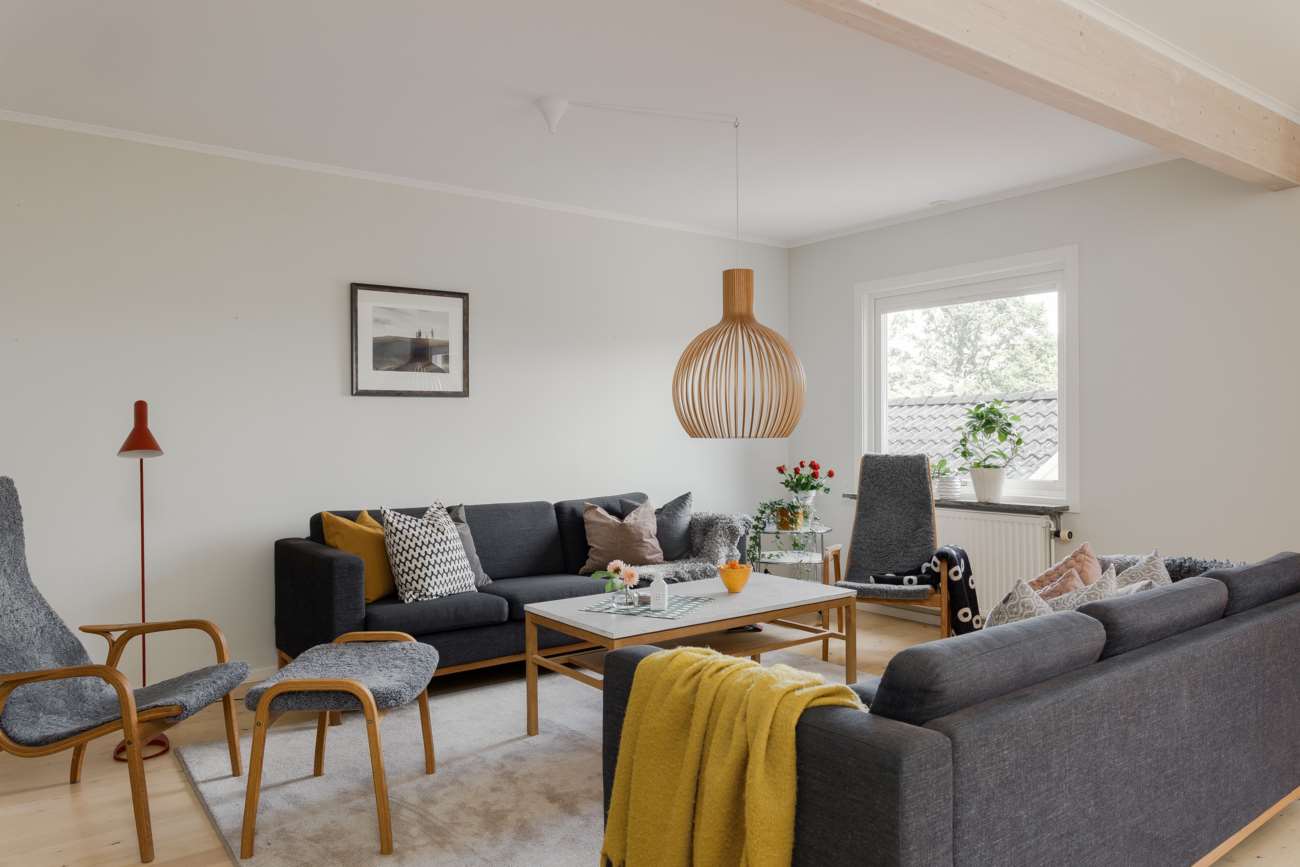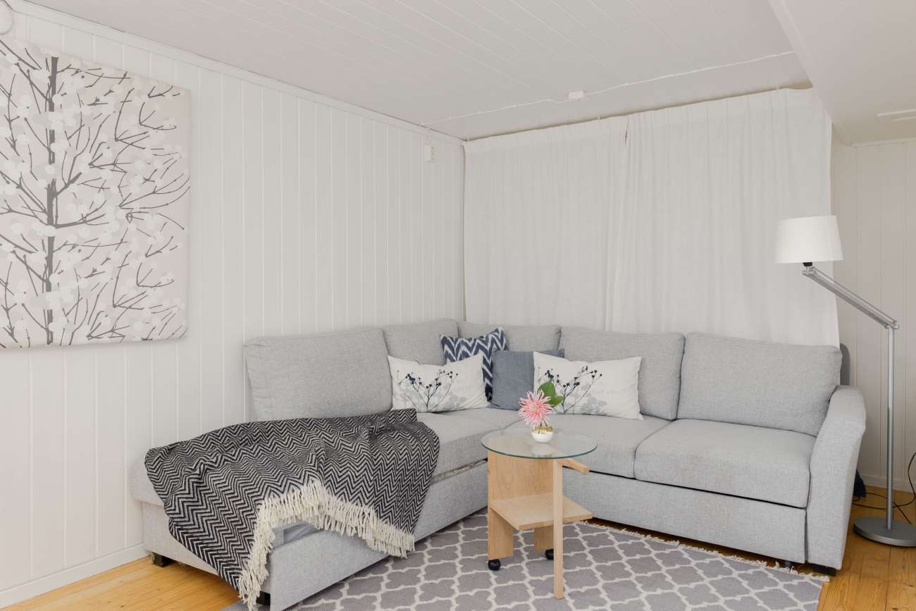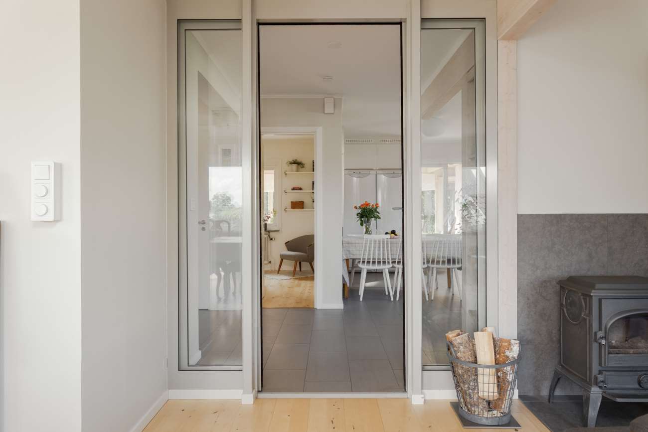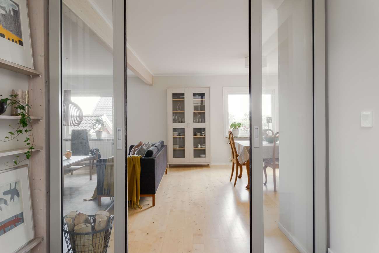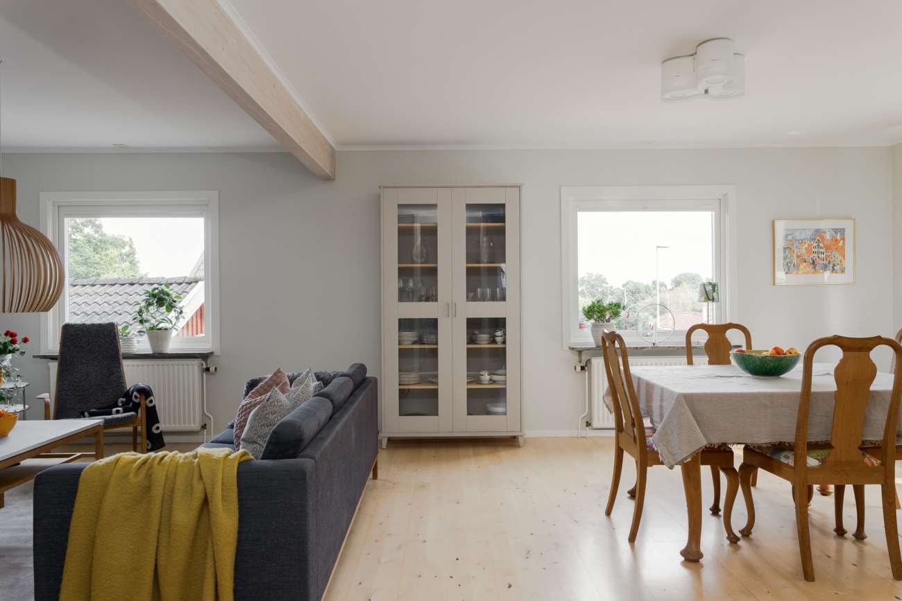 Vardagsrummet ligger i direkt anslutning och erbjuder gott om plats för både soffgrupp och matsalsmöbel. Parkettgolv, stora fönsterpartier och en braskamin skapar en trivsam samlingspunkt året om. På entréplanet finns även ett mindre sovrum, lämpligt som gästrum eller arbetsrum, samt en gästtoalett.
