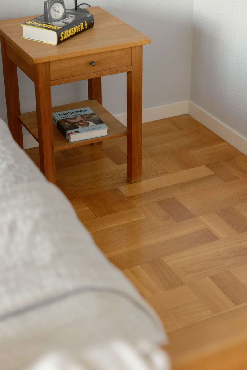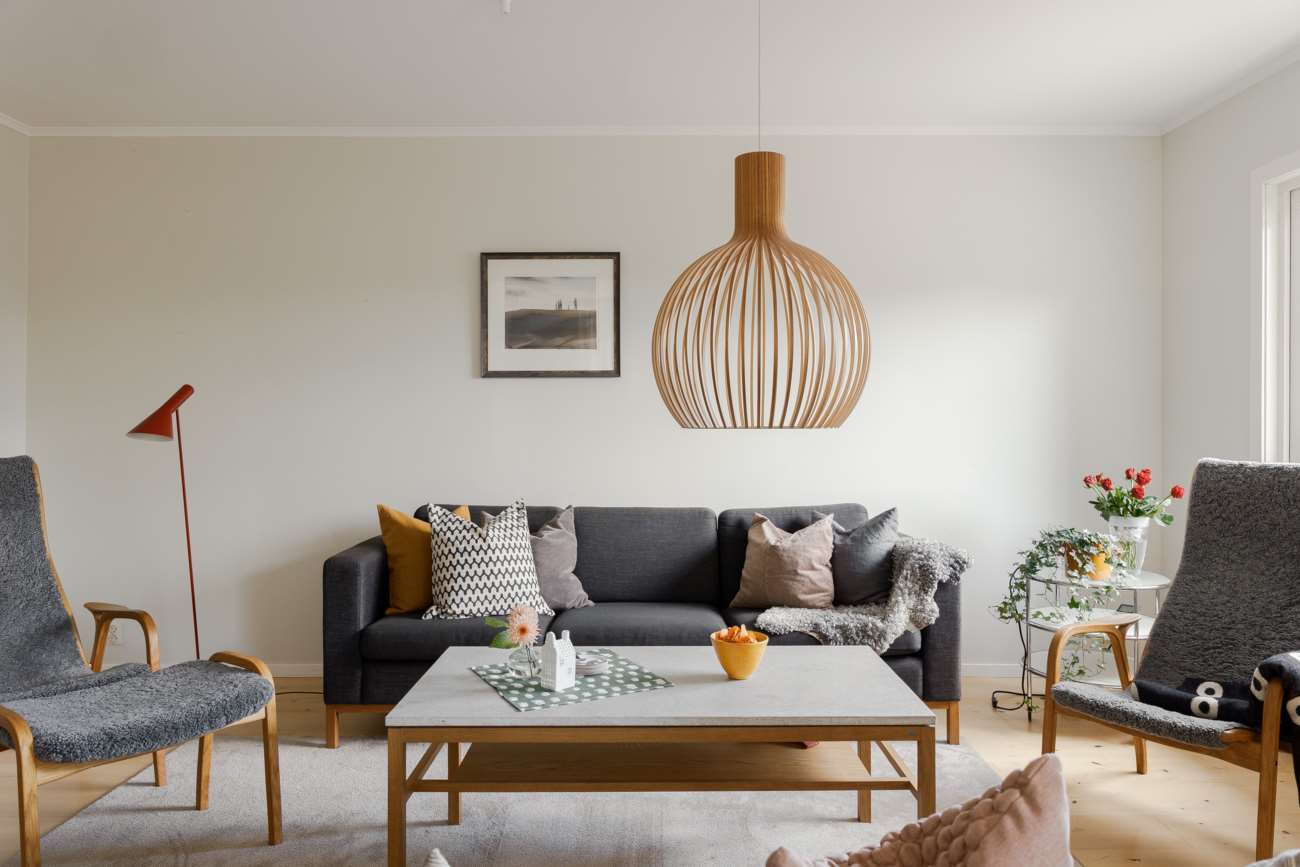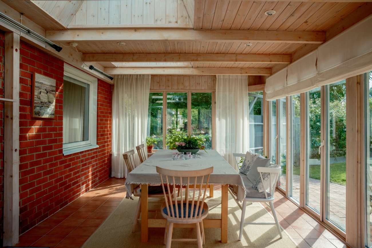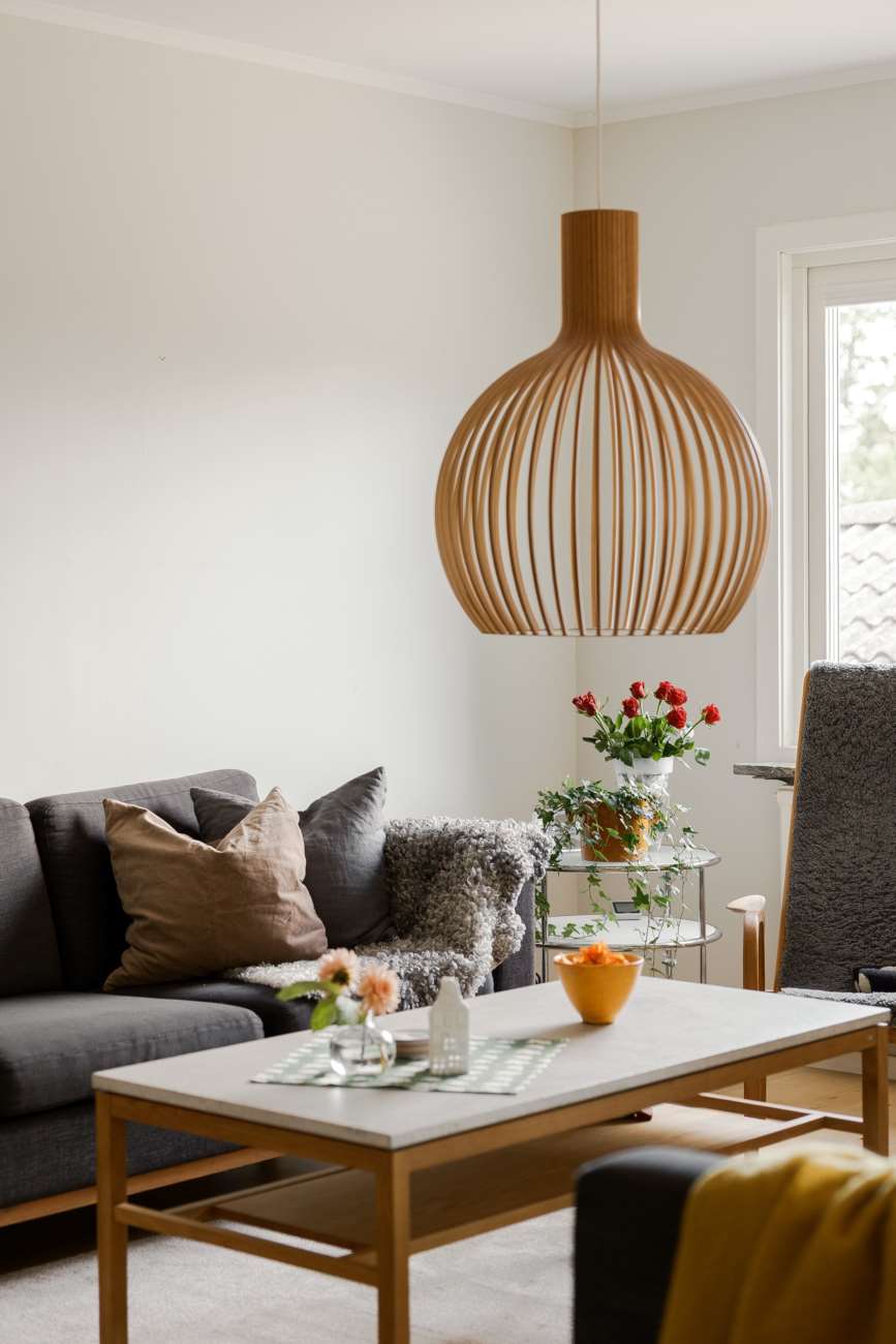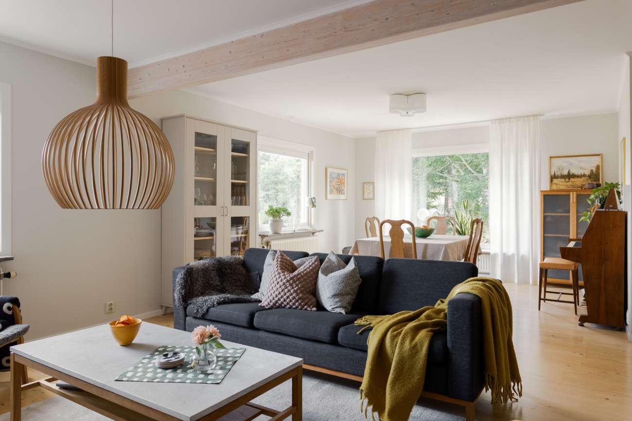Vardagsrummet ligger i direkt anslutning och erbjuder gott om plats för både soffgrupp och matsalsmöbel. Parkettgolv, stora fönsterpartier och en braskamin skapar en trivsam samlingspunkt året om. På entréplanet finns även ett mindre sovrum, lämpligt som gästrum eller arbetsrum, samt en gästtoalett.
