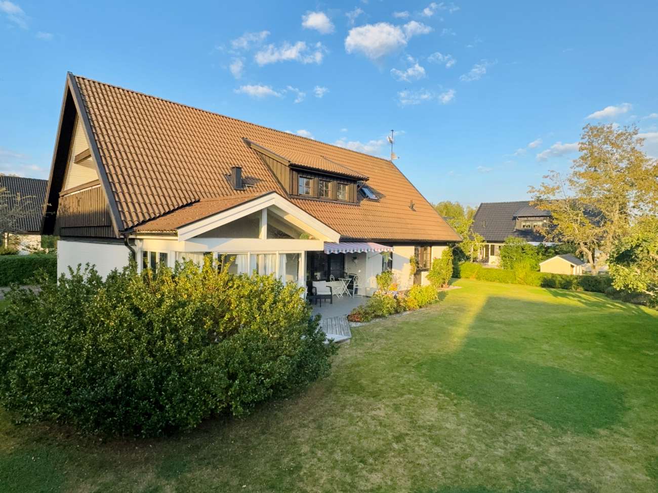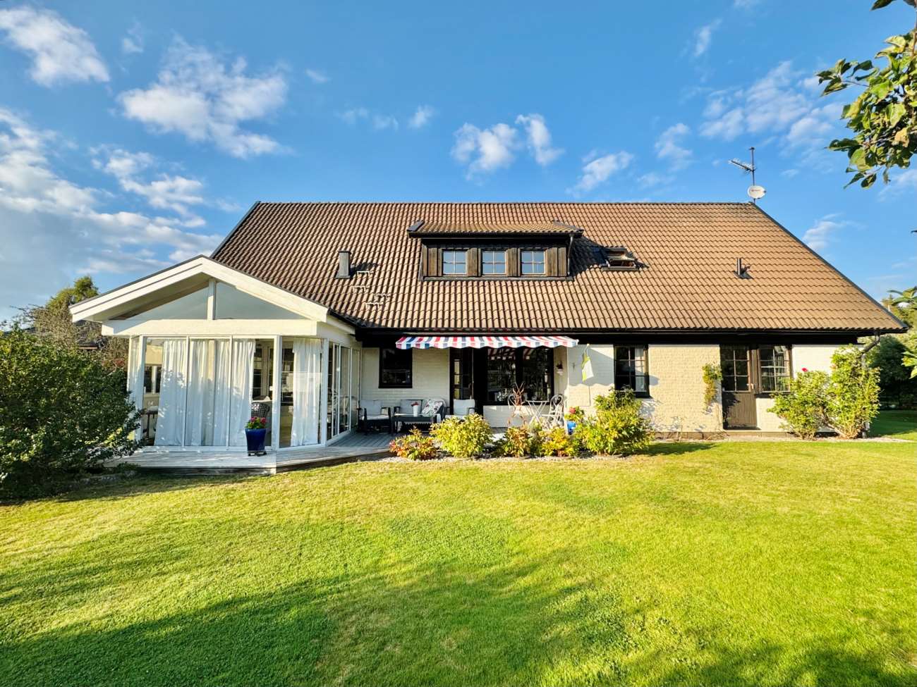 Nytt lägre pris. Här erbjuds en välskött tegelvilla med byggår 1975 i 1 ½ plan med en boyta på 212 kvm. Villan har ett inglasat uterum, en stor balkong, garage samt totalt sju rum, varav upp till fem kan användas som sovrum. Bostaden har två helkaklade badrum med golvvärme – ett med bastu – samt en gästtoalett. Den uppvuxna och charmiga trädgården med häckar, fruktträd och välskötta gräsytor inbjuder till både avkoppling och odling.