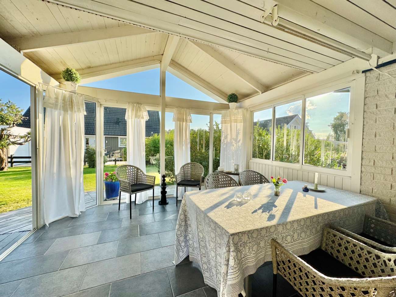 Vardagsrummet, som ligger i anslutning till köket, har ett parkettgolv i holländskt mönster, ljusa väggar och stora fönster som släpper in generöst med dagsljus. Här finns utrymme för både matsalsmöbler och en soffgrupp. Från vardagsrummet når du det inglasade uterummet och det intilliggande trädäcket i söderläge med markis – perfekt för soliga dagar och sköna kvällar.