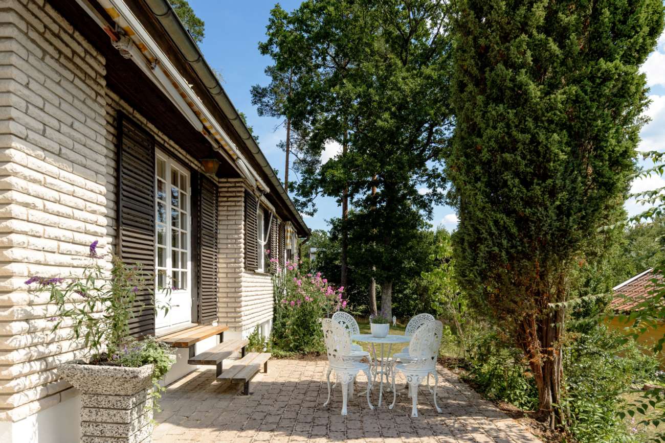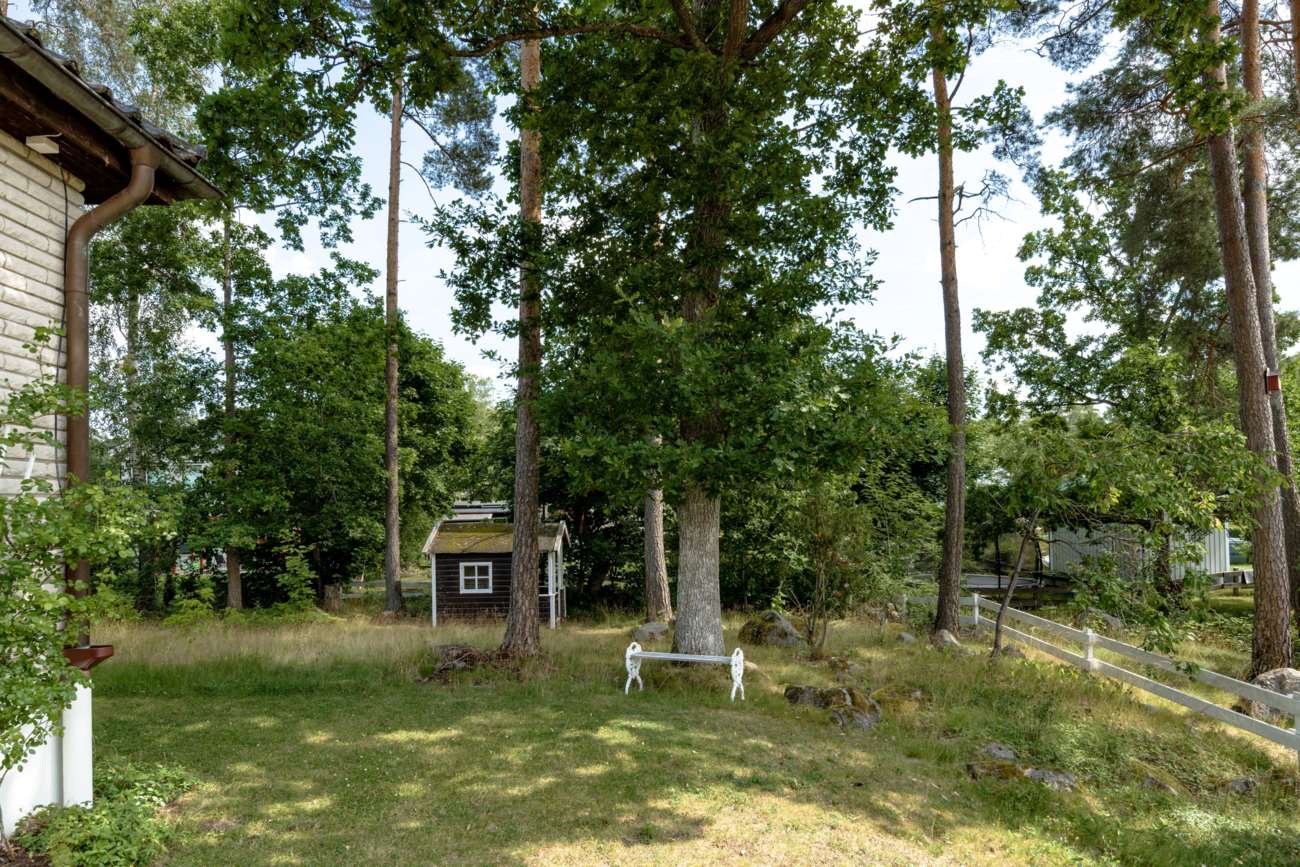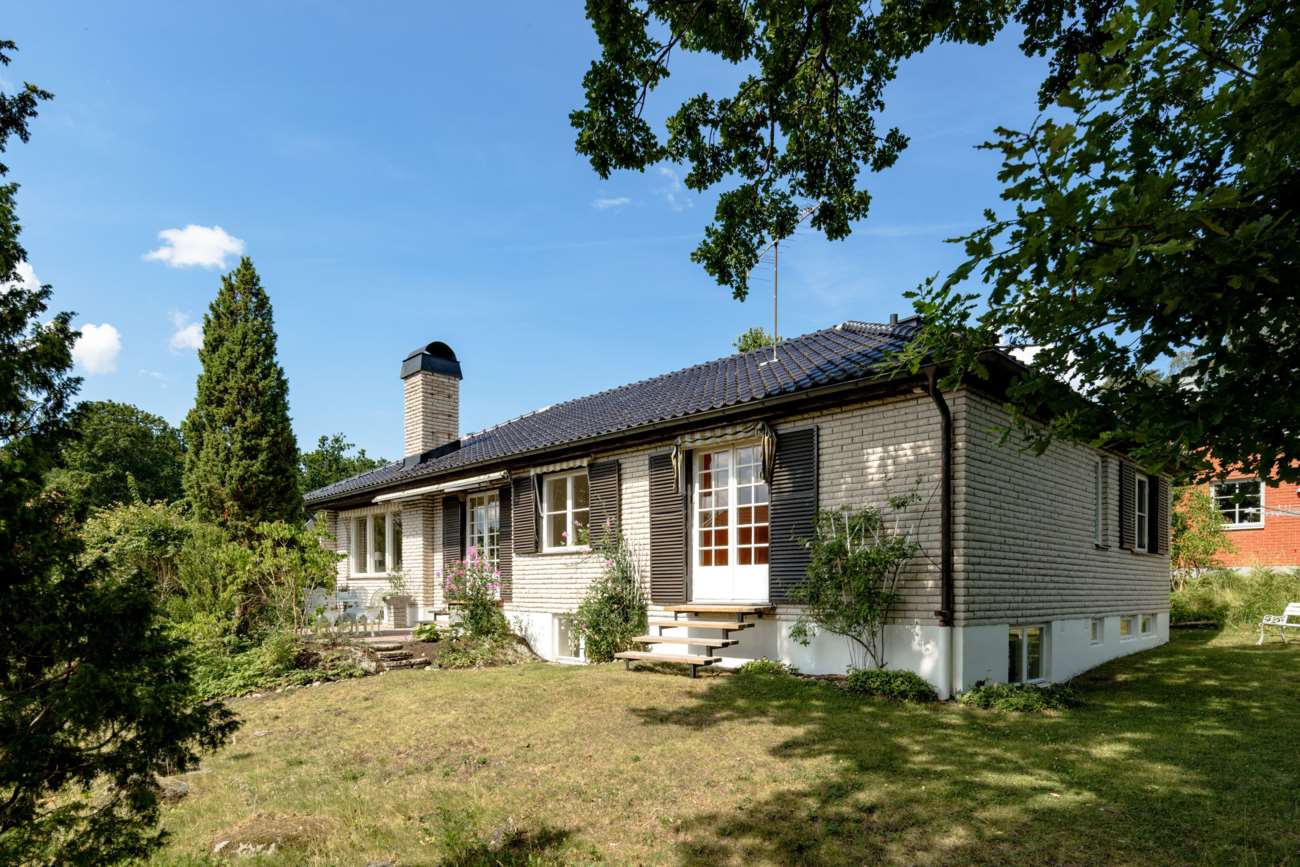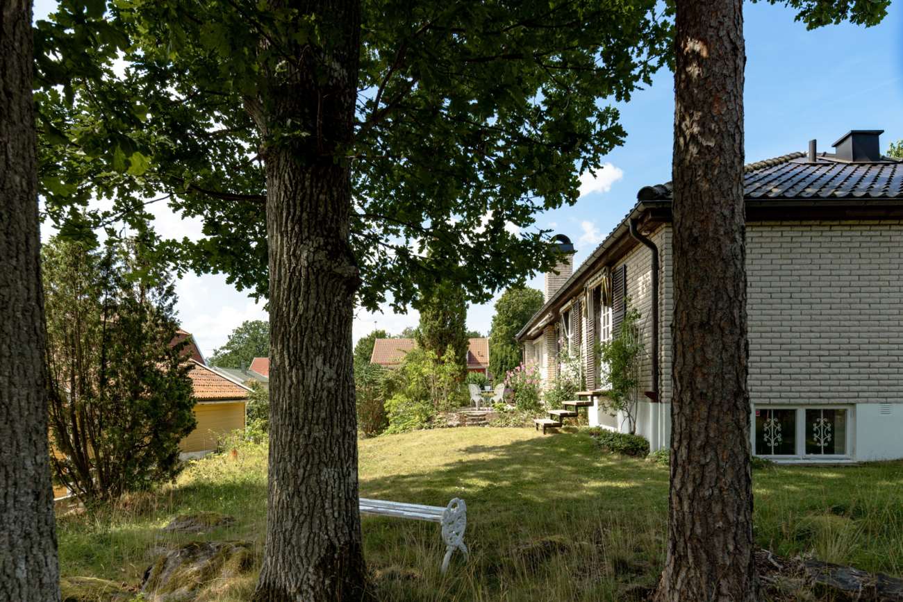 Trädgården är uppvuxen med buskar, grönska och rabatter, och flera uteplatser gör det enkelt att hitta en plats i solen. Garage i anslutning till huset.