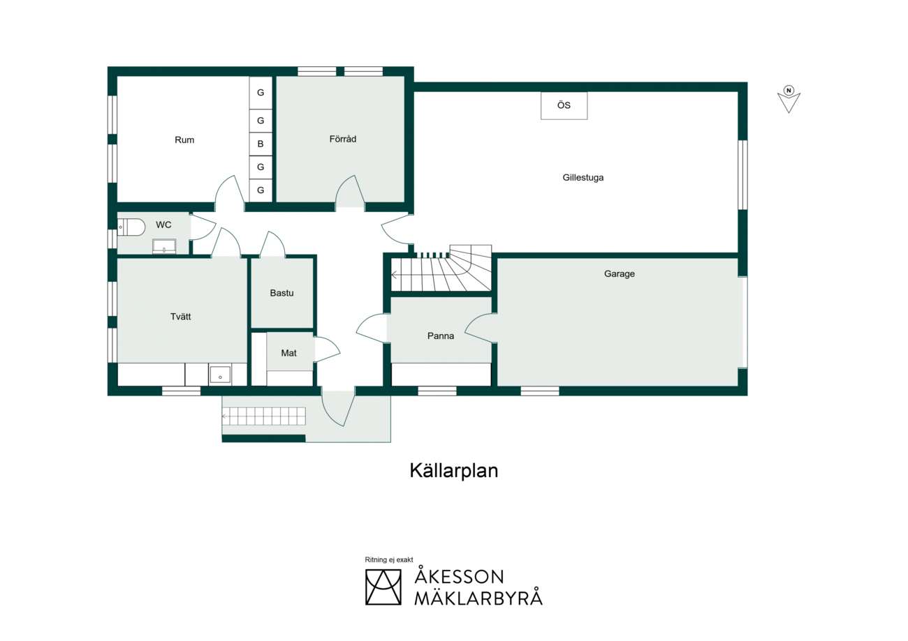 Källarplanet rymmer en ljus gillestuga med fönster längs ena kortsidan och högt placerade fönster längs långsidan. Den stora öppna spisen och takbjälkarna ger rummet karaktär.