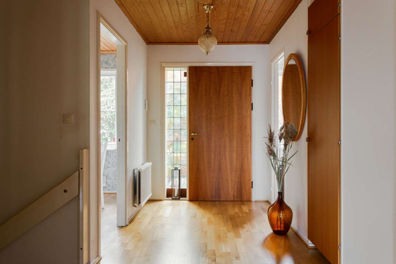 Entrén är ljus och välkomnande med parkettgolv och ett stående sidofönster med blyinfattat glas. Direkt till vänster finns ett mindre rum som lämpar sig väl som klädkammare, och i hallen finns ytterligare en garderob.