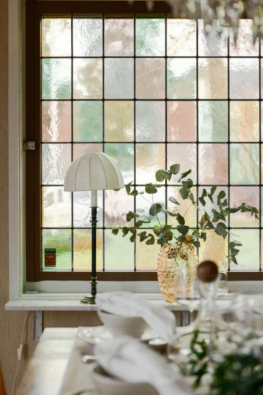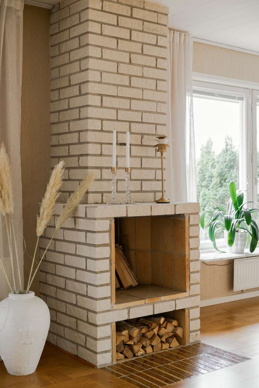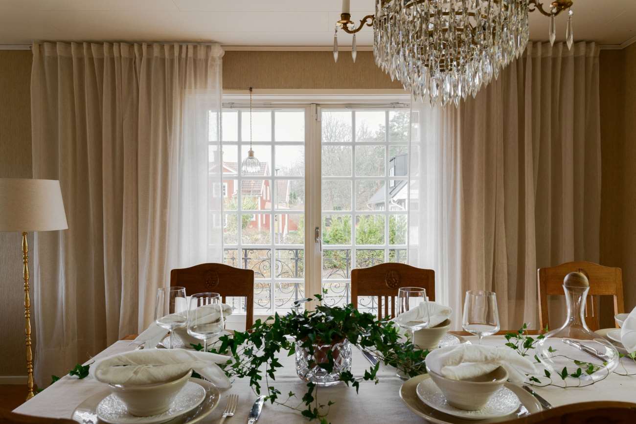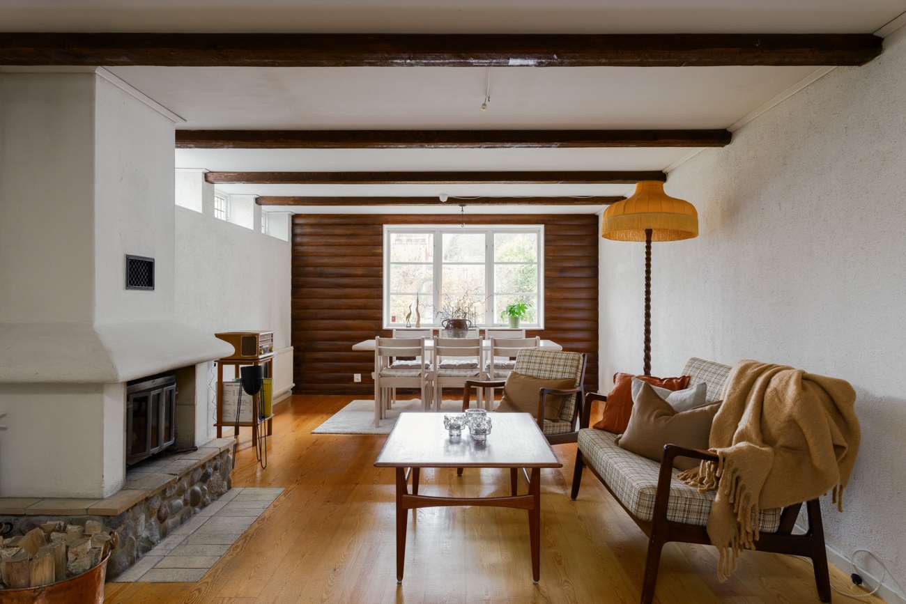 Från köket fortsätter du vidare till vardagsrum och matsal som ligger i vinkel. Rummen har klassisk ekparkett lagd i holländskt mönster och stora fönster som ger ett fint ljusinsläpp. Vid matsalen sitter blyinfattade fönster och i vardagsrummet breder stora fönsterpaneler ut sig. Här finns också en murad öppen spis och klinker på golvet framför eldstaden som följer samma tidstypiska uttryck som kökets kakel. Från både vardagsrum och matsal leder spröjsade dörrar ut till altan respektive balkong.