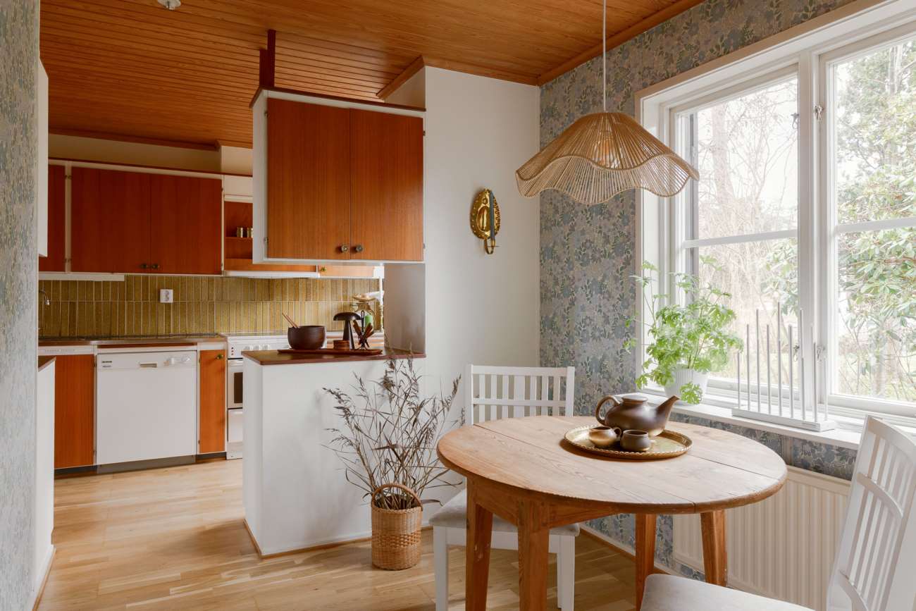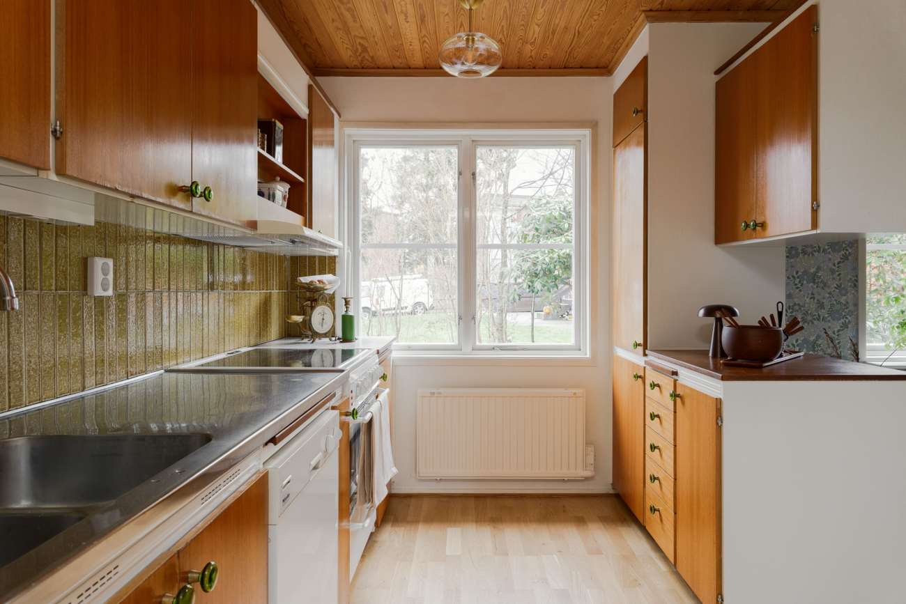 Till höger ligger köket med bra arbetsytor och en trevlig matplats. Här finns tidstypiska tapeter vid matplatsen och ett kakel ovanför köksbänken som harmonierar med de träfärgade luckorna. Köket är utrustat med kyl och frys, spis med ugn, köksfläkt och diskmaskin. På golvet ligger enstavs ekparkett.