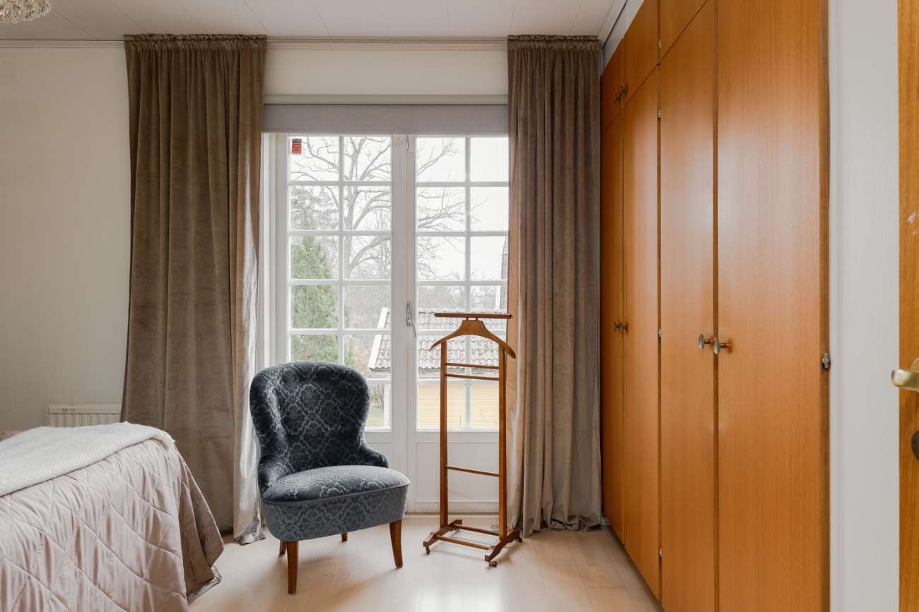 I den bortre delen av entréplanet ligger tre rymliga sovrum med parkettgolv. Det större sovrummet har garderober i originalutförande längs ena väggen och en egen utgång till trädgården. Intill sovrummen finns badrummet med ljusgult kakel, mörkgrått golv, badkar, dusch, kommod med handfat och spegelskåp.I hallen finns fem garderober.