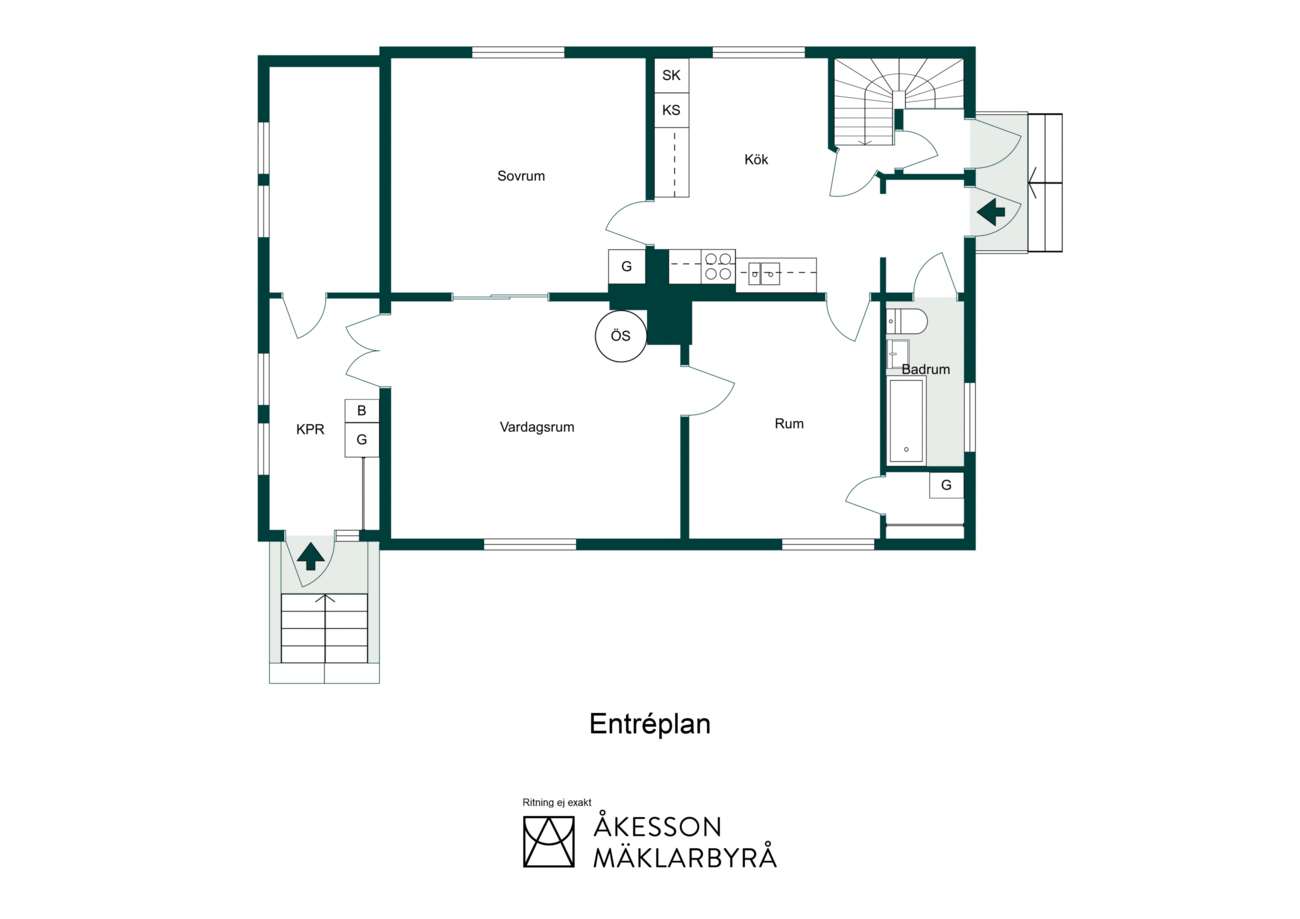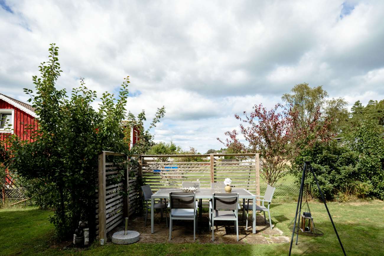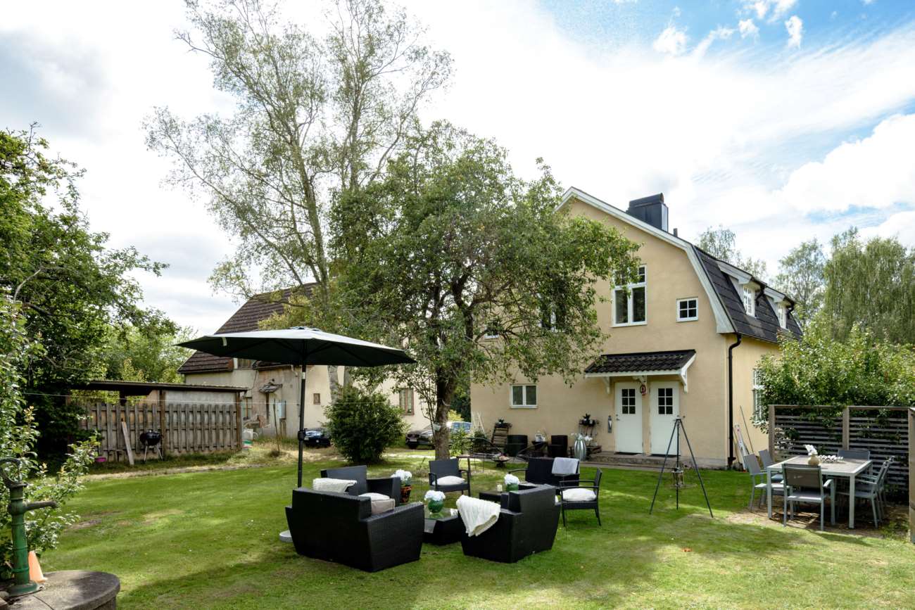 Tomten är grön och uppvuxen med flera uteplatser, ytor för lek och plats för odling. Här finns utrymme att leva – både i det lilla och det stora. En villa med tydlig struktur, bra ljus och möjligheter att anpassa efter livets olika skeden.