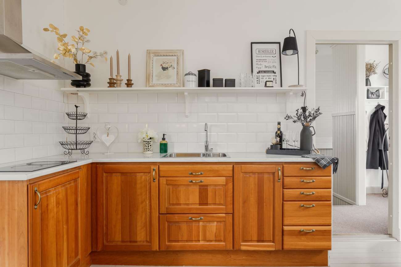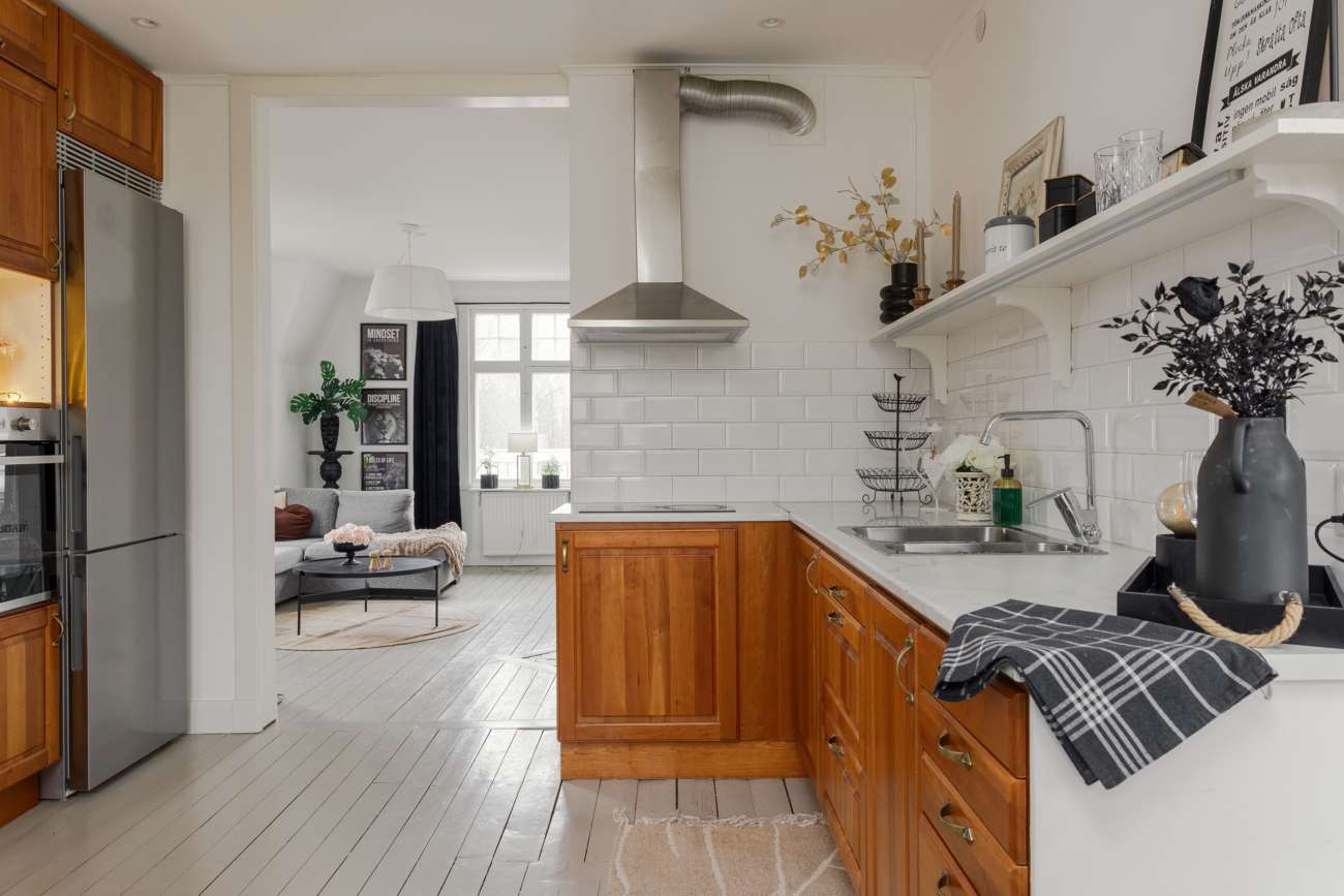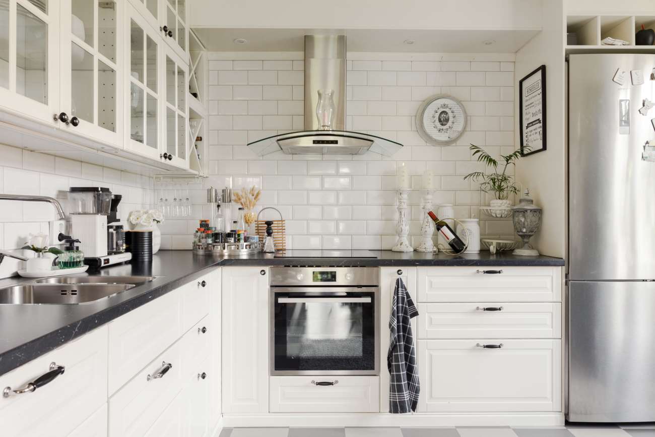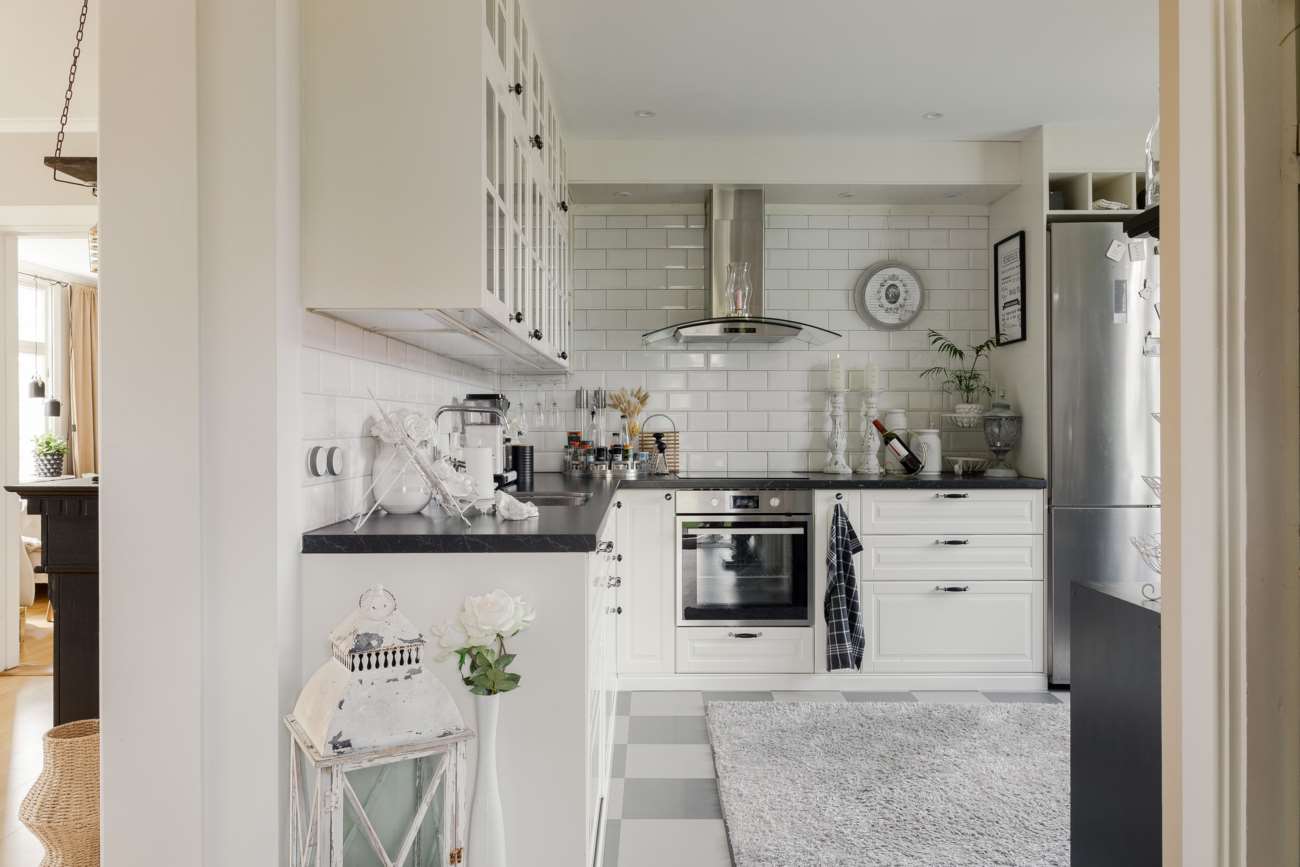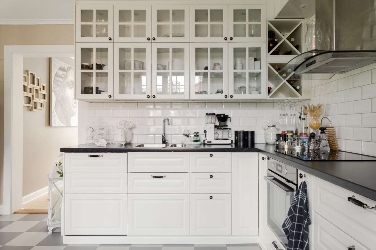 Köket nås i anslutning till sällskapsytorna. Det är rymligt och lantligt i sitt uttryck, med vita luckor, vitt kakel ovanför svarta arbetsbänkar samt ett grå- och vitrutigt golv. Här finns gott om arbetsyta och plats för matbord, vilket gör köket till en naturlig samlingspunkt i vardagen.