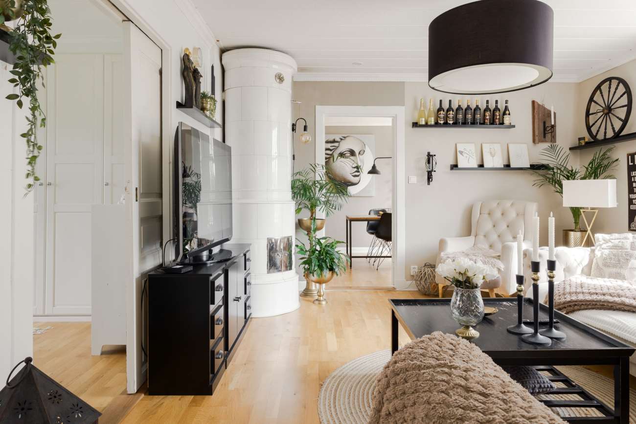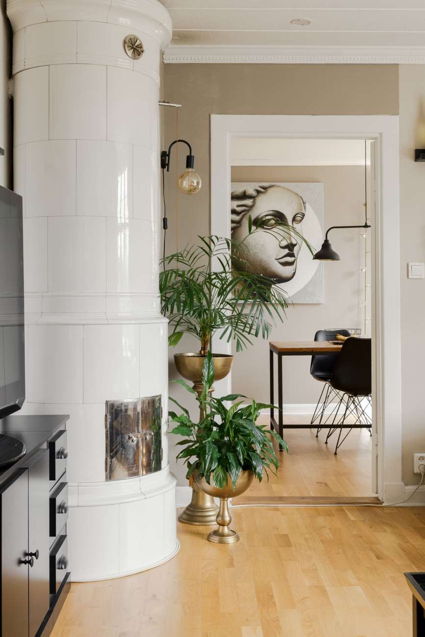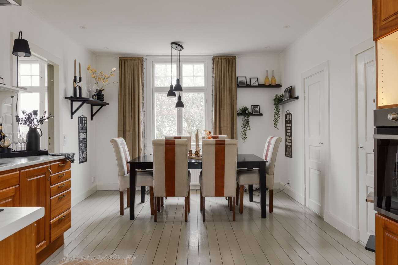 Vidare in i huset öppnar sällskapsytorna upp sig. Vardagsrummet ligger centralt och binds samman med matsalen i en öppen disposition. Enstavs ekparkett löper genom rummen och de stora fönsterpartierna ger ett generöst ljusinsläpp. Kakelugnen är placerad som rummets självklara mittpunkt och bidrar både med värme och karaktär.