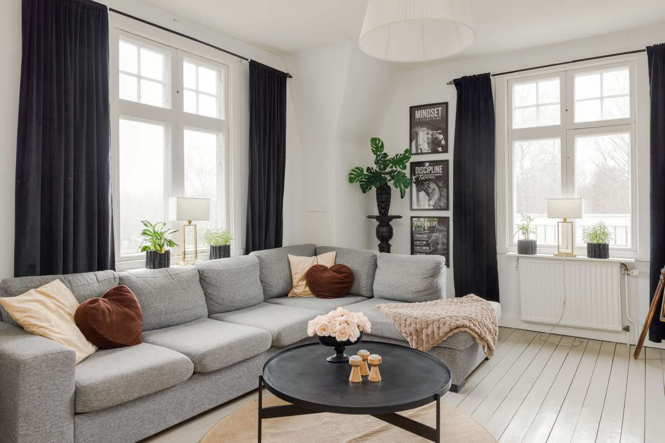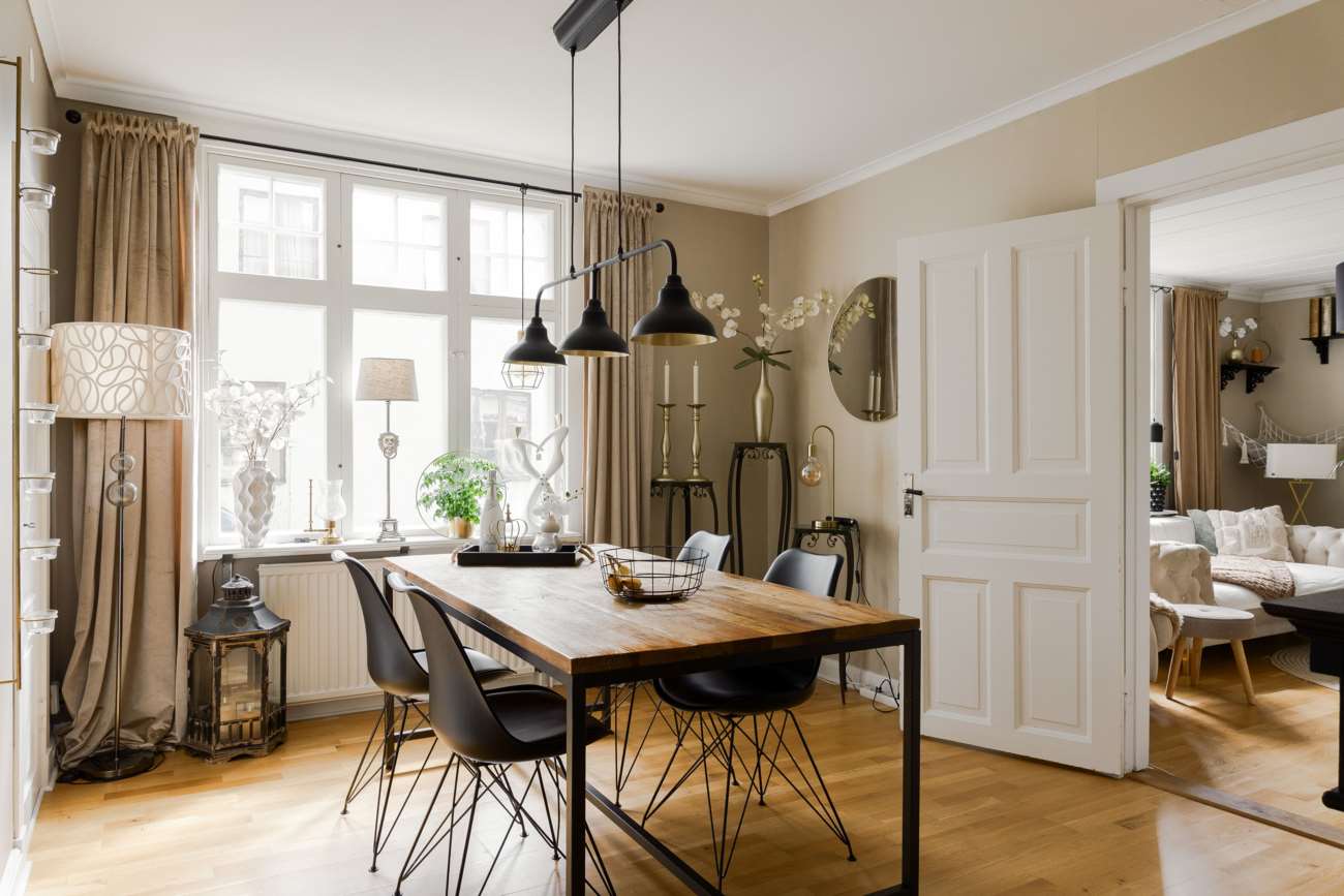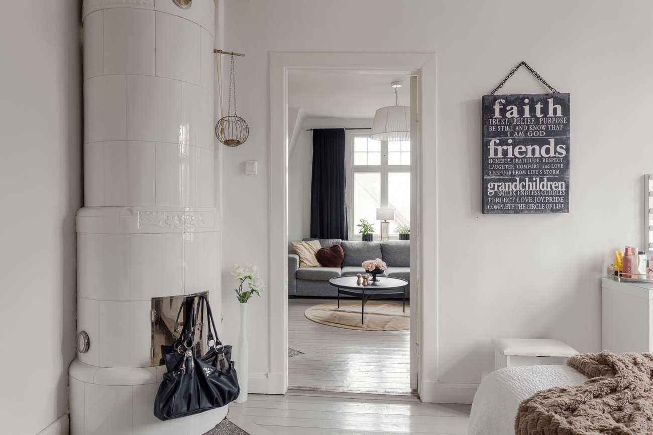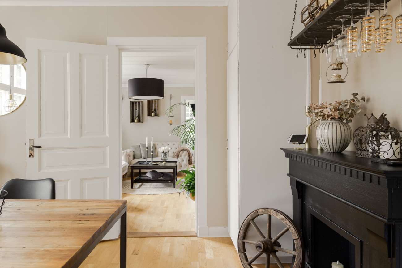 Vidare in i huset öppnar sällskapsytorna upp sig. Vardagsrummet ligger centralt och binds samman med matsalen i en öppen disposition. Enstavs ekparkett löper genom rummen och de stora fönsterpartierna ger ett generöst ljusinsläpp. Kakelugnen är placerad som rummets självklara mittpunkt och bidrar både med värme och karaktär.