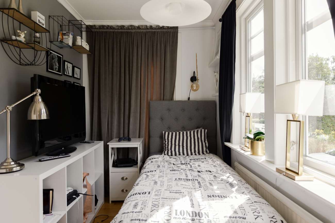 På entréplanet finns även ett mindre sovrum som lämpar sig väl som barnrum, gästrum eller arbetsrum.