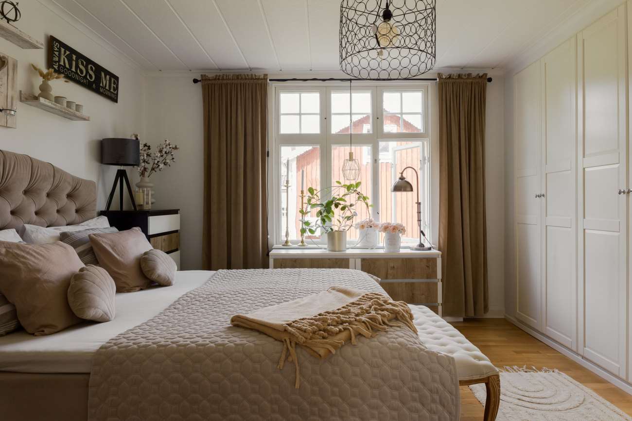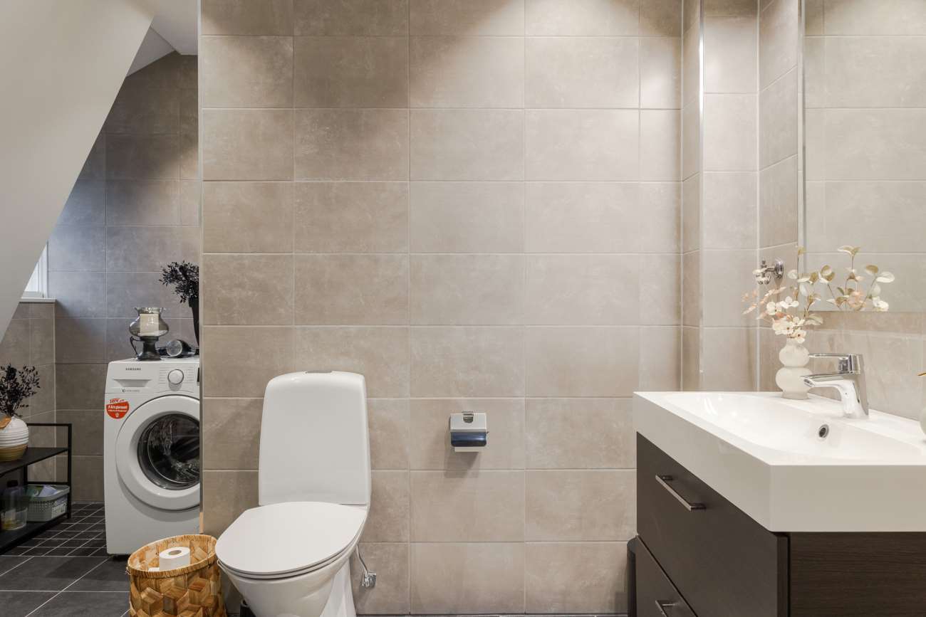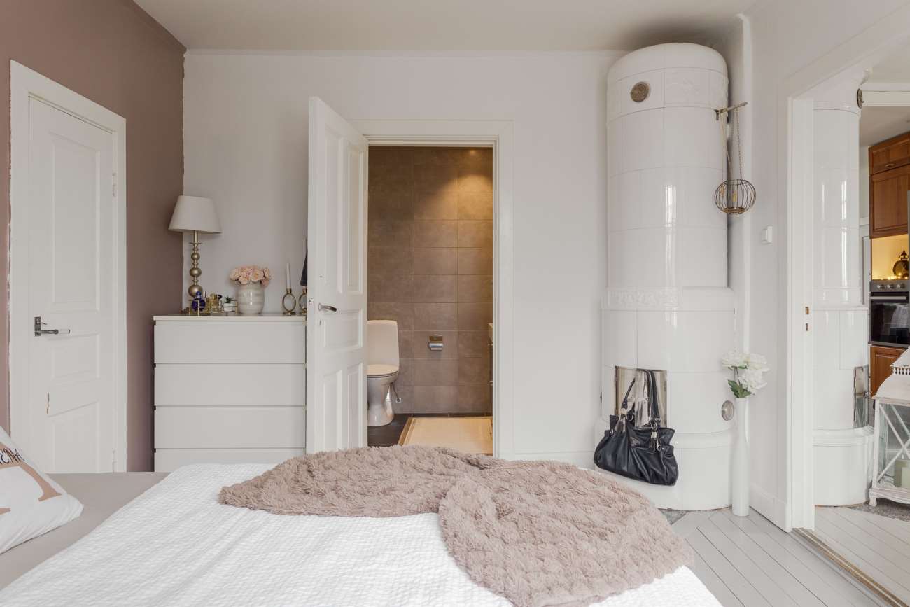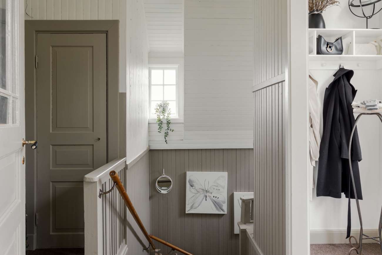 En trappa upp möts man av en hall som fördelar ytorna på övre plan. Här ligger det större sovrummet, med plats för dubbelsäng och god förvaring. Rummet har en egen kakelugn som förstärker karaktären och ger extra värme under årets kallare månader. I direkt anslutning finns ett en suite-badrum, helkaklat med mörkgrå klinker (golvvärme) och ljusare grått kakel. Här finns dusch, wc, grå kommod med handfat samt tvättmaskin – en praktisk och avskild lösning som förenklar vardagen.