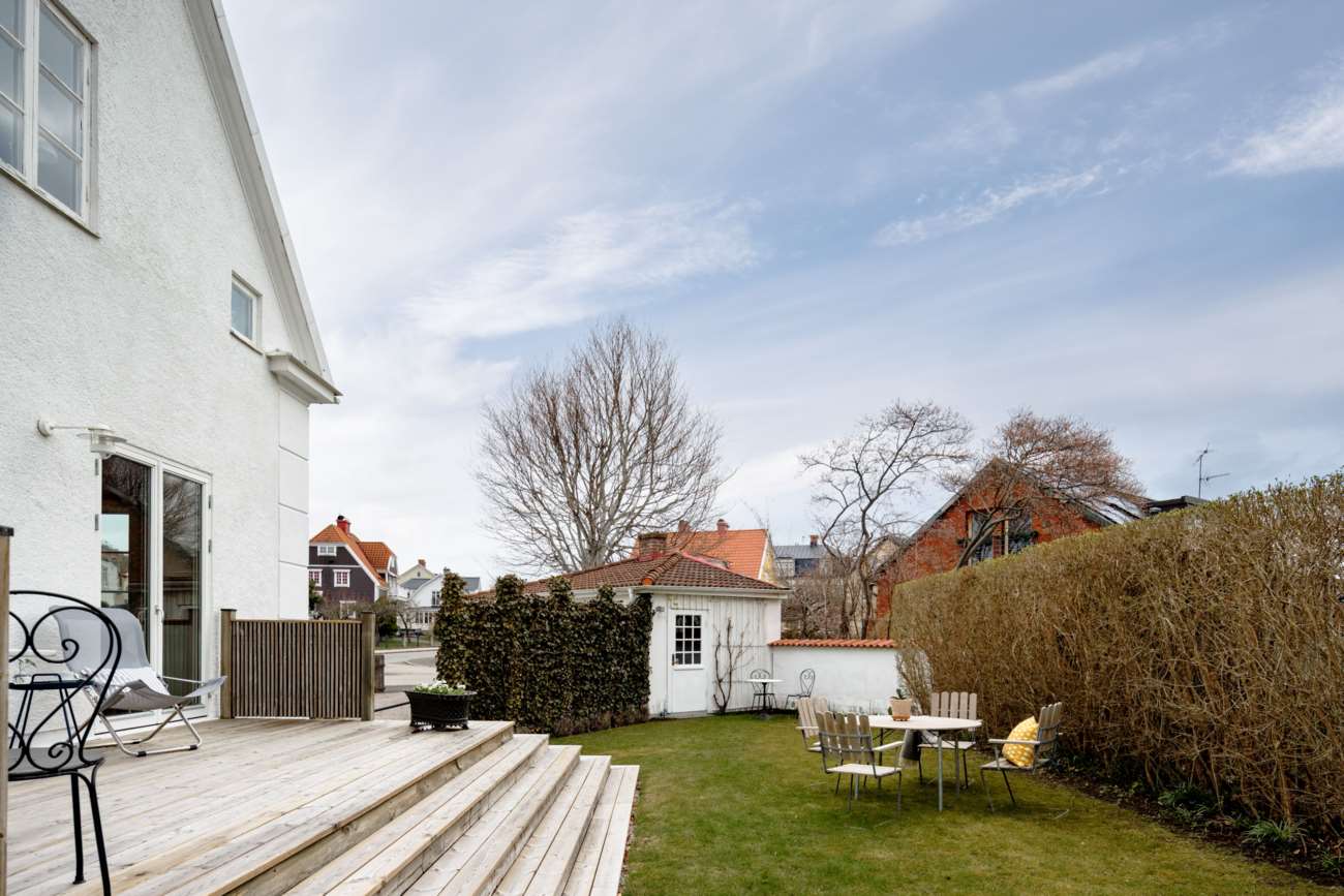 Tomten är välskött och lätt att ta hand om. En grusad gång leder fram till huset. På baksidan, avskärmad med plank och port, ligger en mer privat del av trädgården med altan i söderläge. Här finns gott om plats för utemöbler och odlingar.