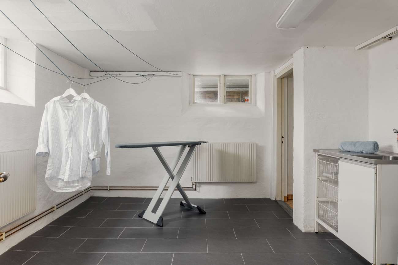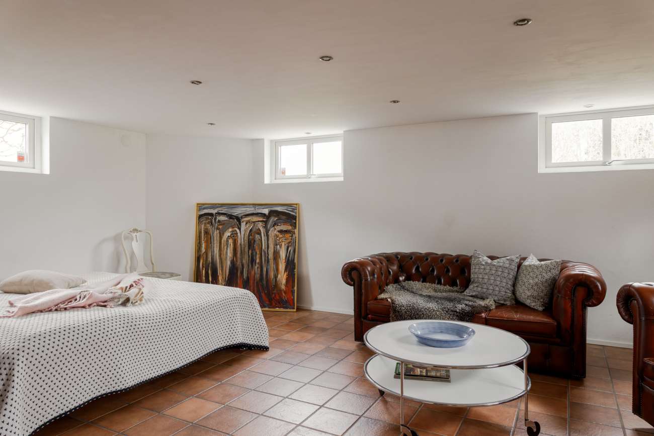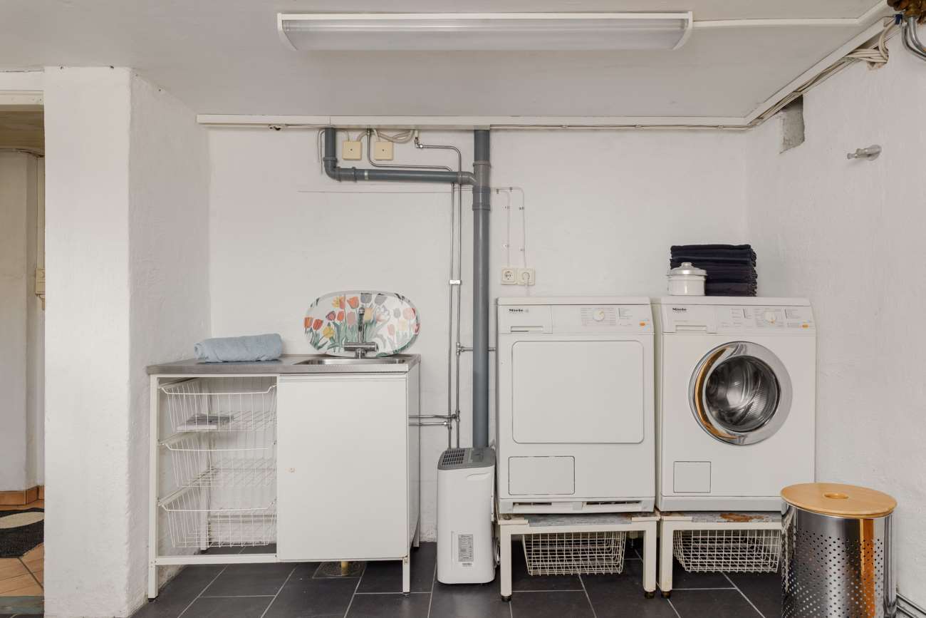 Källaren erbjuder extra ytor som kan användas efter behov – exempelvis som gästrum, ungdomsrum, allrum eller förvaring. Här finns även ett badrum med dusch och WC samt en rymlig, helkaklad tvättstuga utrustad med tvättmaskin, torktumlare och tvättho. Källaren har även en separat ingång från utsidan.
