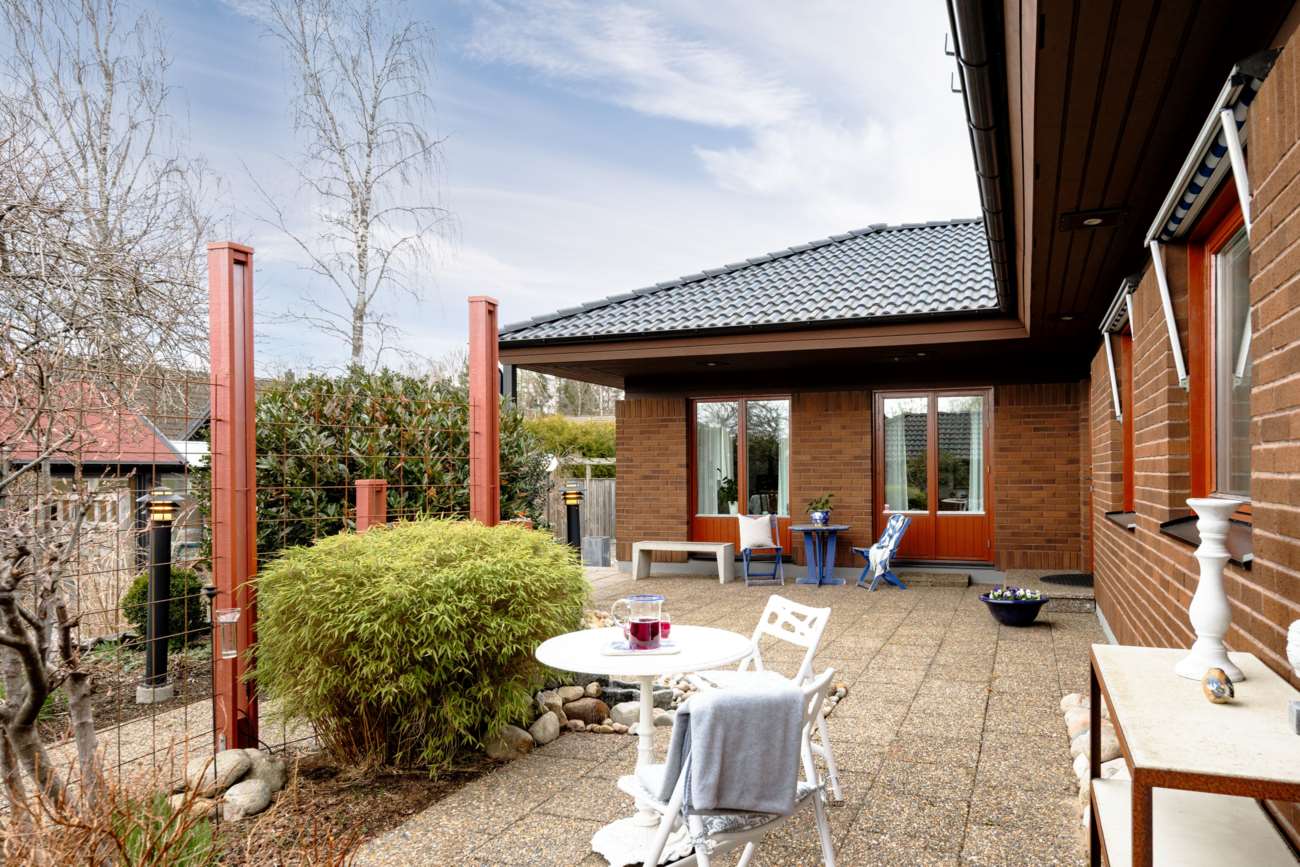 Redan vid tomtgränsen märks omsorgen. Uppfarten är stensatt och trädgården upparbetad i flera rum, omgärdade av växtlighet, belysning och porlande vatten från fontäner. Det friliggande uterummet, framtaget i samspel med arkitekt, tillför ytterligare en dimension - en flexibel yta som kan anpassas efter behov över tid.