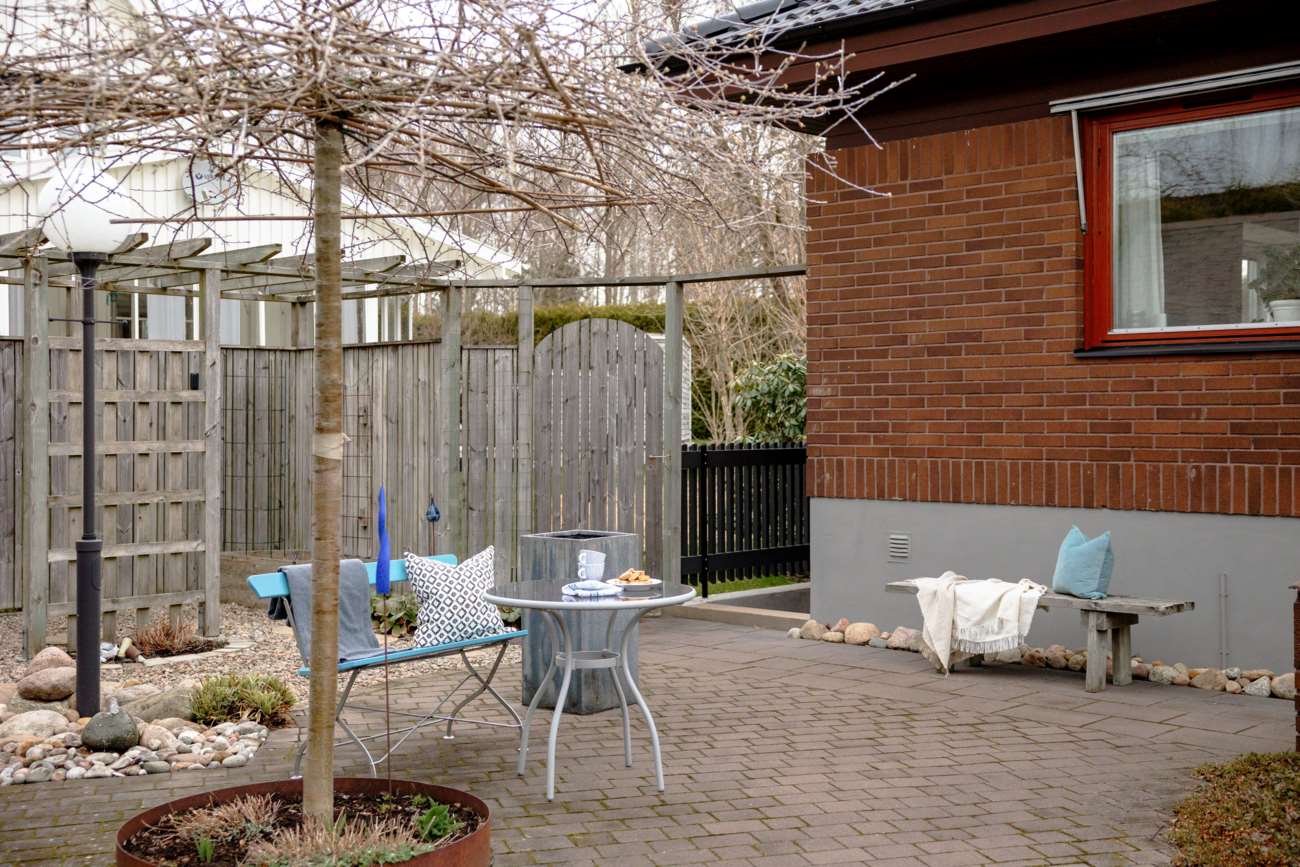 Utemiljön är tydligt prioriterad och omsorgsfullt upparbetad. Stensättningar ramar in trädgården och skapar flera naturliga avdelningar, vilket ger en variation i hur ytorna kan användas - från sociala delar till mer avskilda platser.