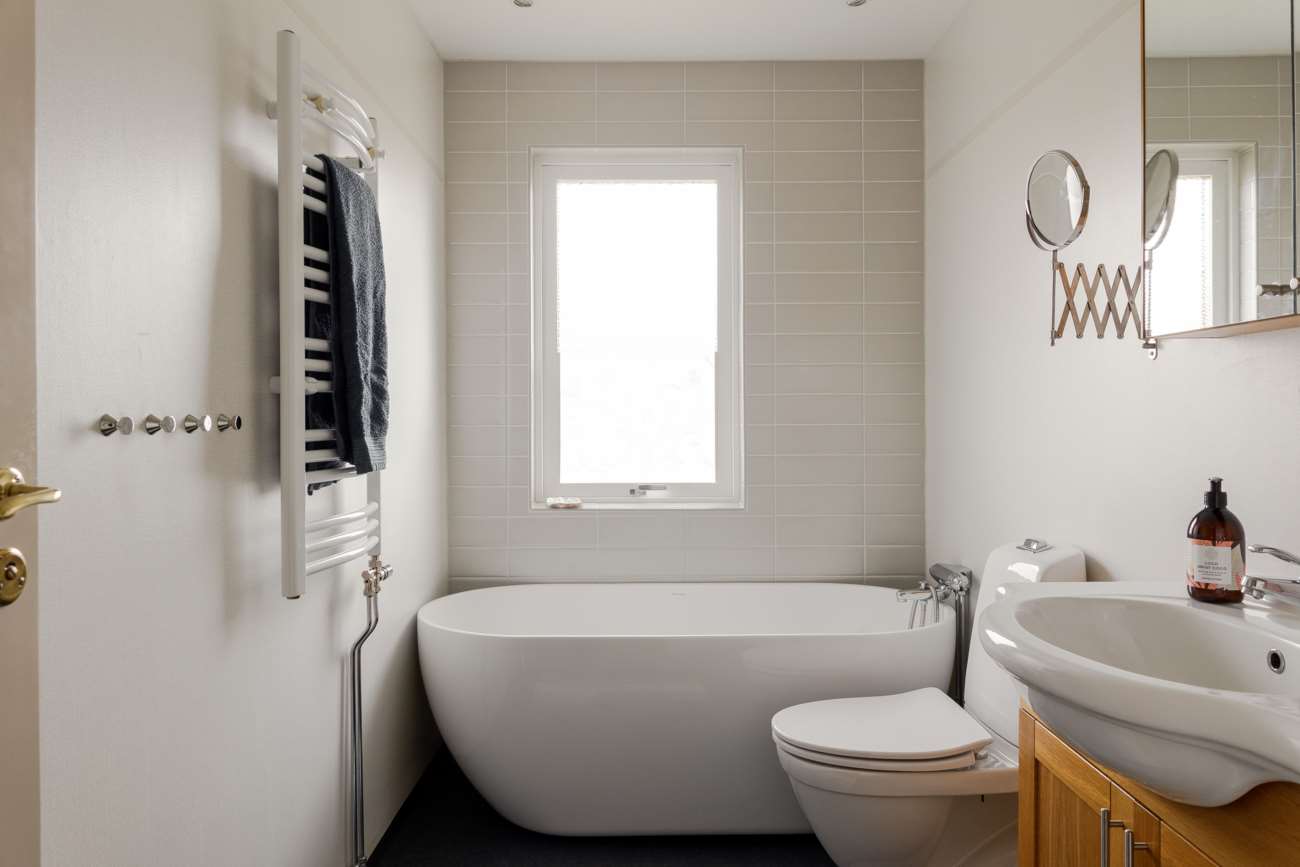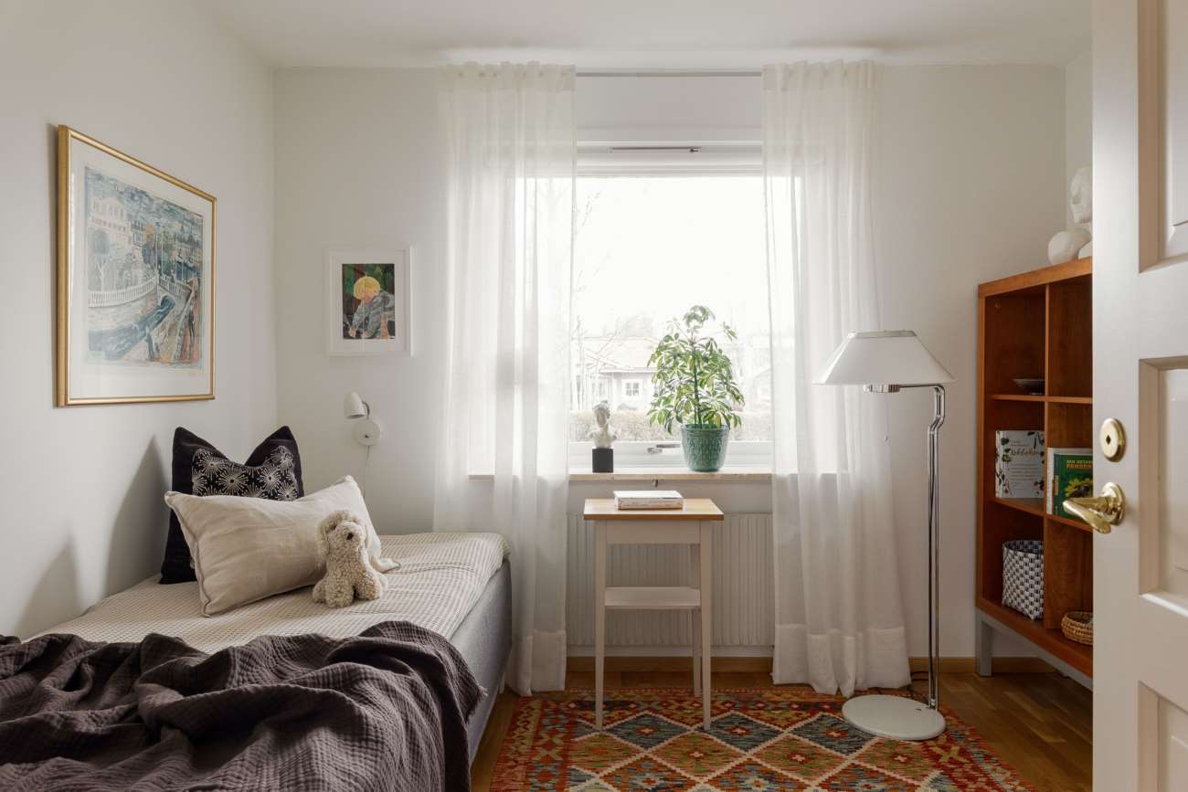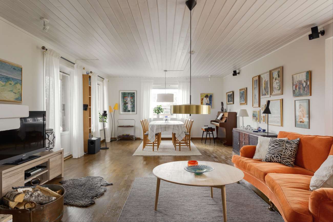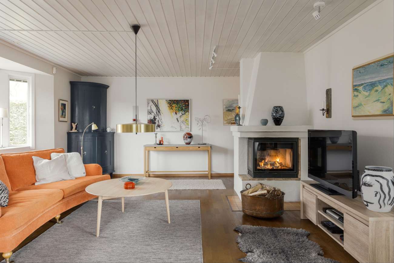 Husets mest uttrycksfulla rum är vardagsrummet. Generöst i storlek, med fönster i tre väderstreck och ett burspråk som ger både karaktär och ett rikt ljusinsläpp. Här märks hur rummet får leva med årstiderna. Eldstaden blir en självklar samlingspunkt under årets kallare månader, medan ljuset tar över under vår och sommar. Ett rum som använts, uppskattats och fått stå i centrum.