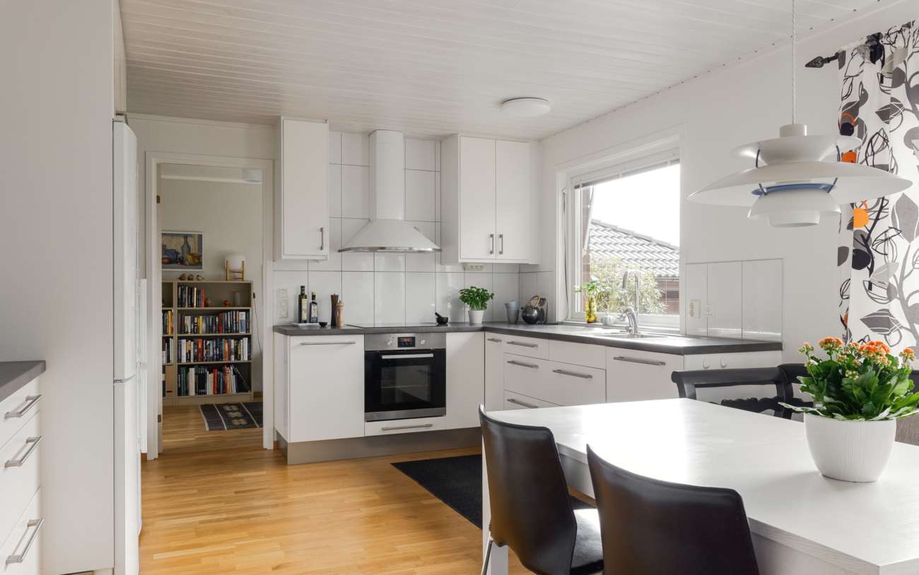 Köket är funktionellt planerat med goda arbetsytor, förvaring och plats för matbord. Här finns en tydlig tanke kring hur vardagen ska fungera med lösningar som håller över tid.