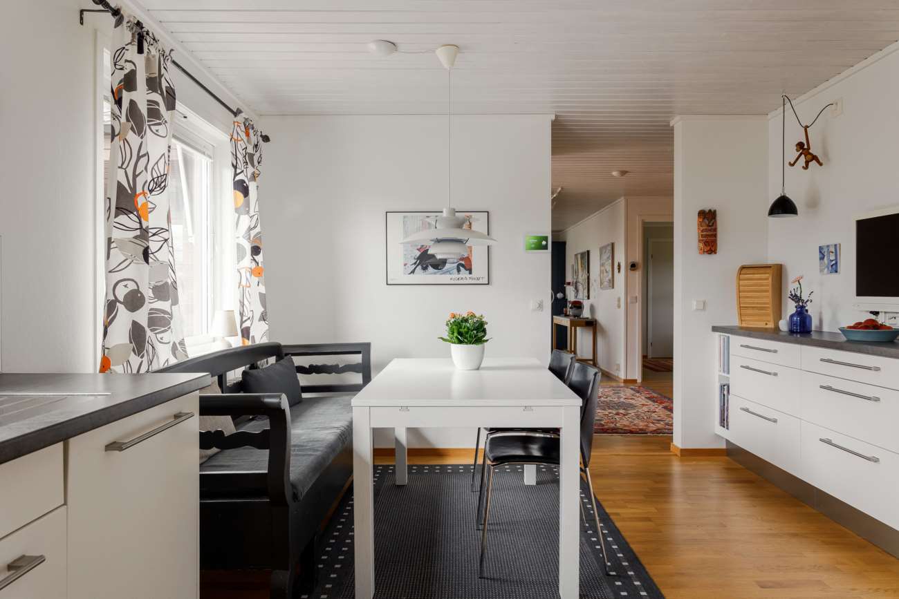 Intill ligger matbordet med direkt koppling till altanen. En naturlig plats för både vardagsmiddagar och helgfrukostar. Tillsammans blir det en social yta som fungerar lika bra i det lilla som vid större tillfällen.