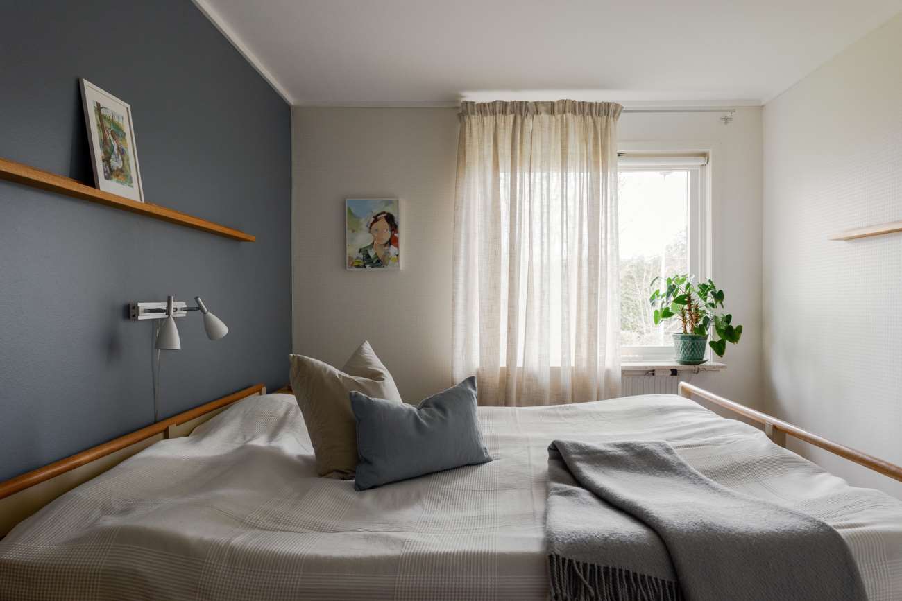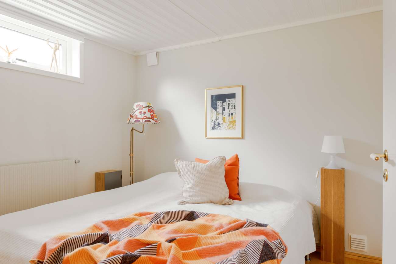 Tre sovrum är samlade i den mer privata delen av huset. Förvaringen är väl löst med garderober, klädkammare och en walk-in-closet. Badrummet har ett badkar, wc samt kommod. Gästtoaletten ligger i anslutning till entrén.