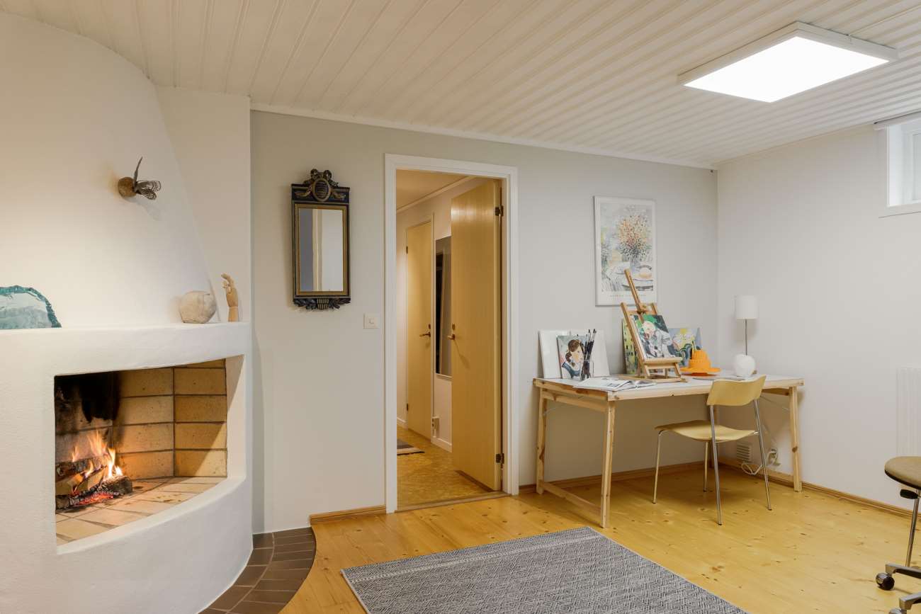 Källaren rymmer flera användbara utrymmen där den tidigare gillestugan har delats av till både hobbyrum och gästrum. På planet finns även dusch och wc samt gott om förvaringsmöjligheter. Här ryms bland annat matkällare, skafferi, klädförvaring och en praktisk snickarhörna. Även här märks ett hus som tagits om hand och anpassats efter behov, med flexibilitet för tonårsdel, arbetsrum eller träningsyta över tid.